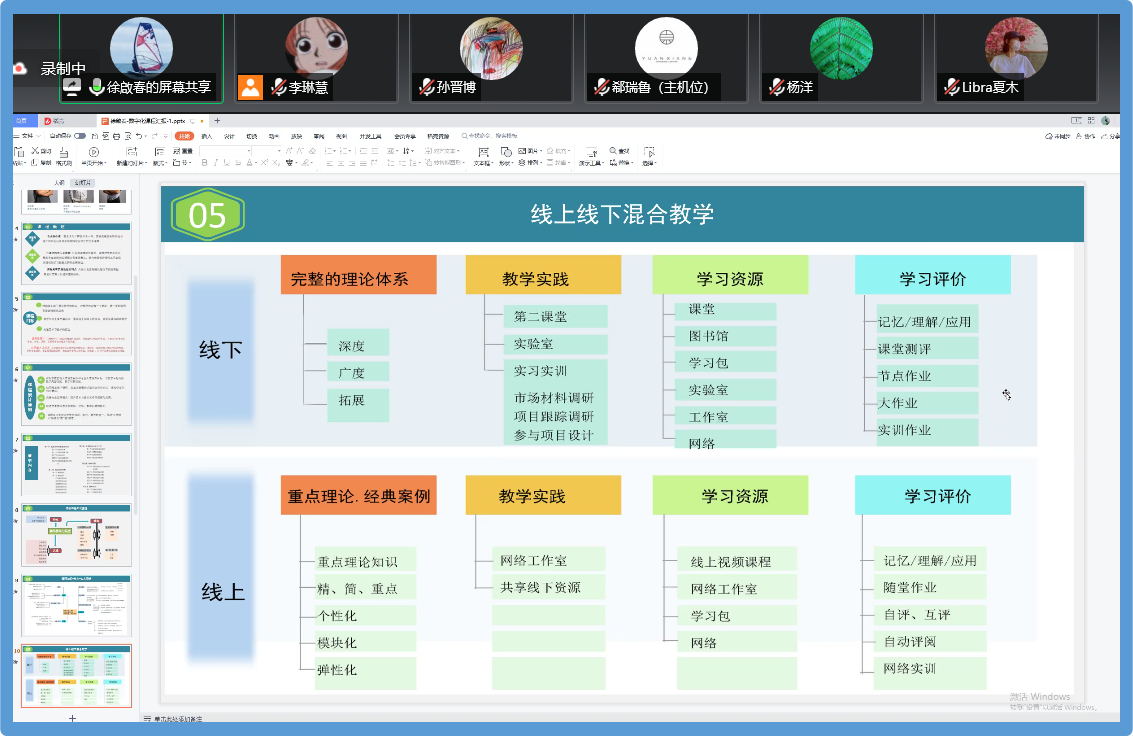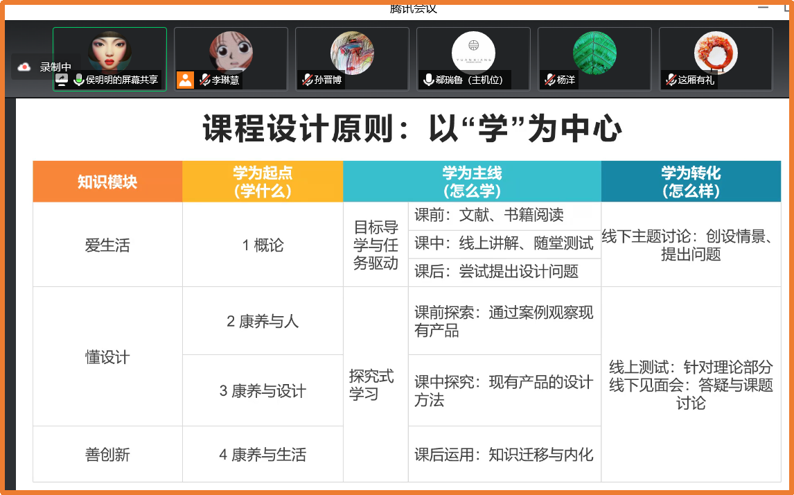 此次汇报以汇报人及课程为主路线,分别有陈琳院长主持的《中国建筑史》、兰华丽老师主持的《标志设计》、何经老师主持的《控制性详细规划》、等六位教师课程。分享以课程建设为例,以课程转化、内容、形式、途径、效果为核心,阐述各自课程建设定位、课程背景、课程目标以及课程设计的原理、课程的特色。其内容为如何吸引学生学习为重要关键点,例如课程内容的呈现方式效果、如何运用知识点激发学生学习、如何帮助学生巩固理解知识点、除了理论知识学生是否可以获得其他启发,或通过理论转为实践等这些问题。教师们也通过对课程章节的计划、课程内容分配、各课程组与后期团队沟通课程整体制作方式一一做出了各自解决方案并规划了后期脚本制作以及拍摄的进度安排。据此学院副院长陈琳与系主任与专业负责人(杨洋、陈放、王宏信、郗瑞鲁、吴耀华、陈晓龙)依对这批“一专业一课程”课程建设成果,对以上汇报内容进行了评价与建议。