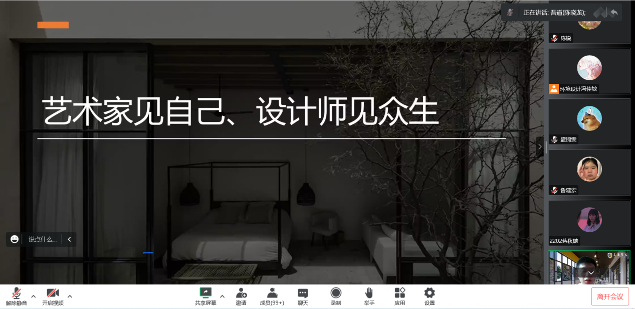 2022年9月19日上午9:00,国际&艺术设计学院环境设计专业2022级全体新生迎来《开学第一课》。专业主任为同学们展示了学习与实验实训环境,详细的解读了人才培养方案,介绍了教研室全体专业教师团队,帮助同学们完成角色过渡。虽然遗憾没有在校园相聚,在线上的同学们也非常开心,对即将迎来的线下开学充满期待。