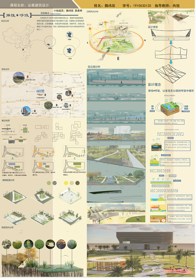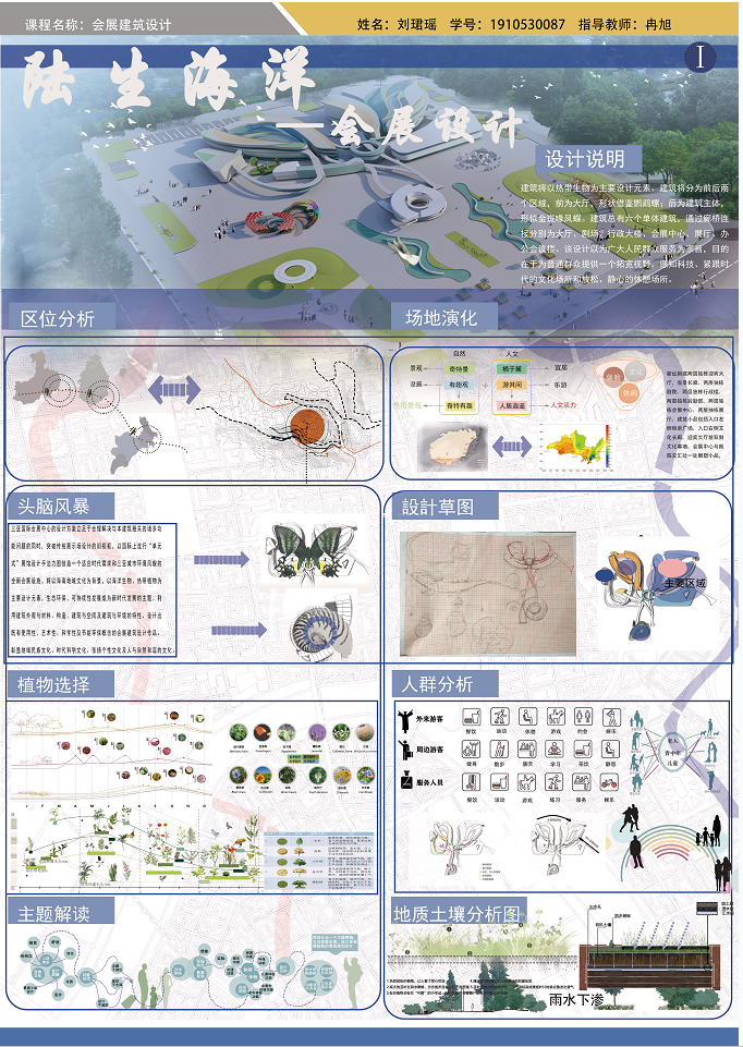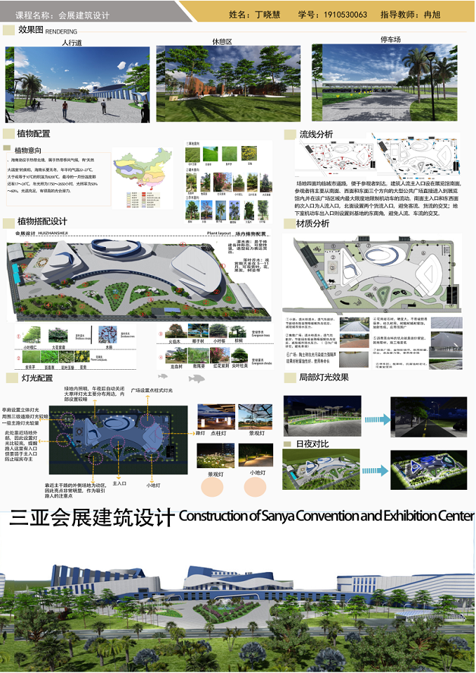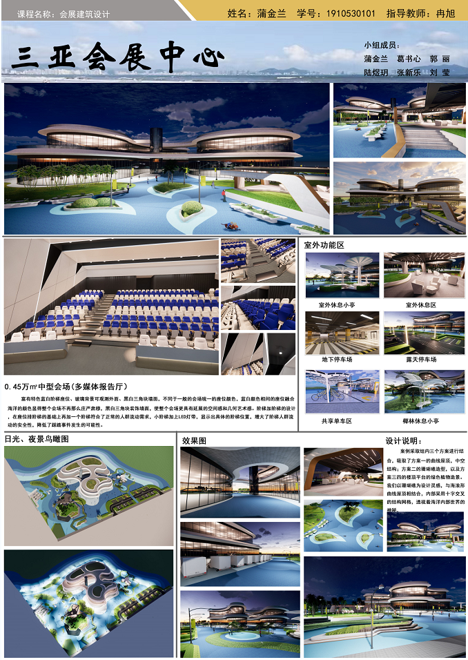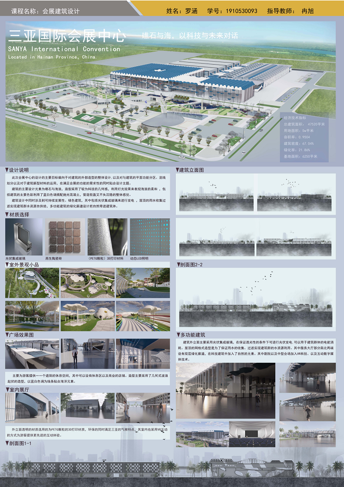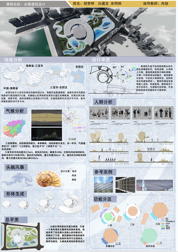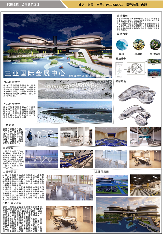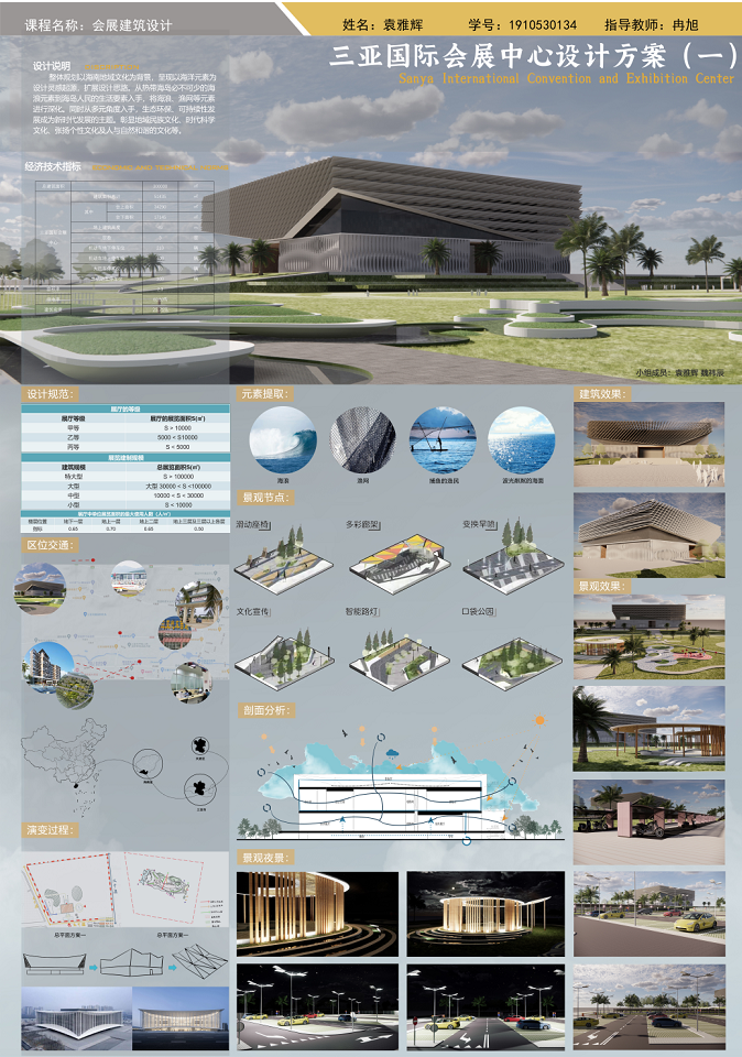 以海南地域文化为背景,以海洋生物、热带植物为主要设计元素,充分体现设计者丰富的想象力,扩展思路,深化构思。生态环保、可持续性发展成为新时代发展的主题。利用建筑外观与材料、构造、建筑与空间及建筑与环境的特性。设计出既有使用性、艺术性、科学性及节能环保概念的会展建筑设计作品。彰显地域民族文化、时代科学文化、张扬个性文化及人与自然和谐的文化等。