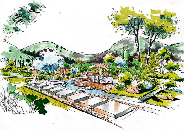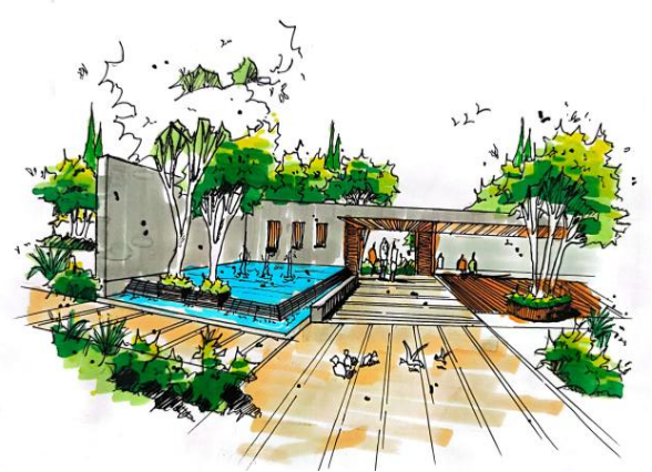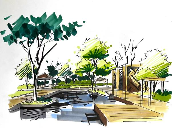 这学期同学们从比例尺寸,排线密度,色彩搭配,基本透视甚至于马克笔的使用等等多方面进行学习。草图,大致的定型以及透视灭点的寻找是为关键,决定着最后景观小品以及构筑物的基本结构是否井然。其中透视亦为重点,因为距离,视点等等原因所产生的景致便会不同。当然不止这些,最后的上色,色彩的搭配、个人的色感,便会变得非常重要,不同颜色的选择就是不同的呈现。