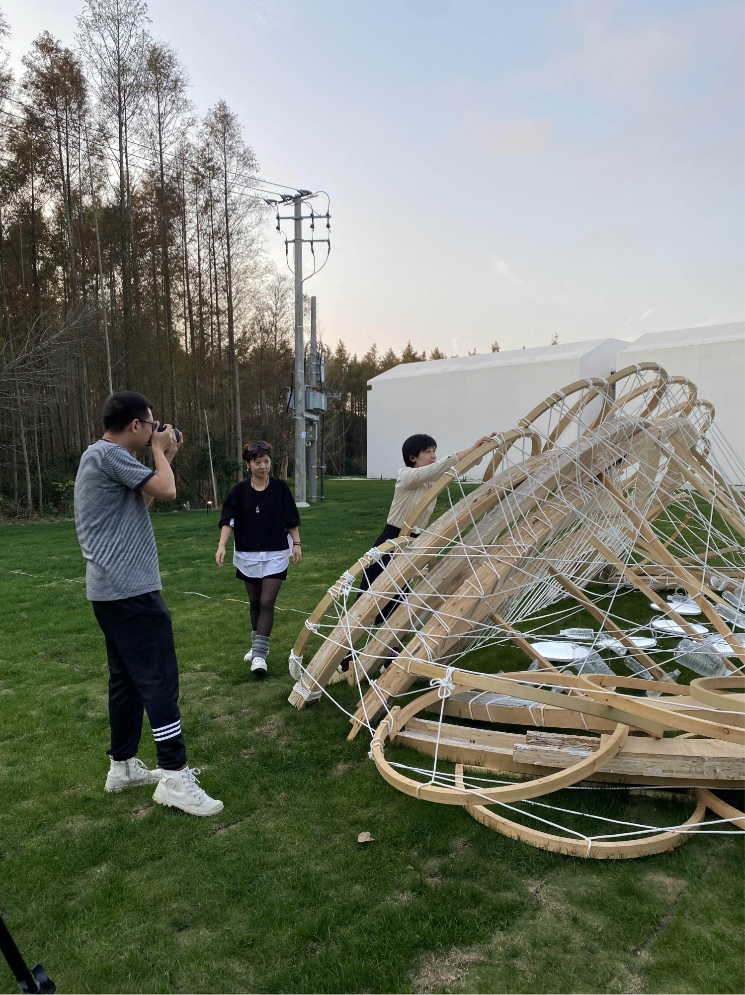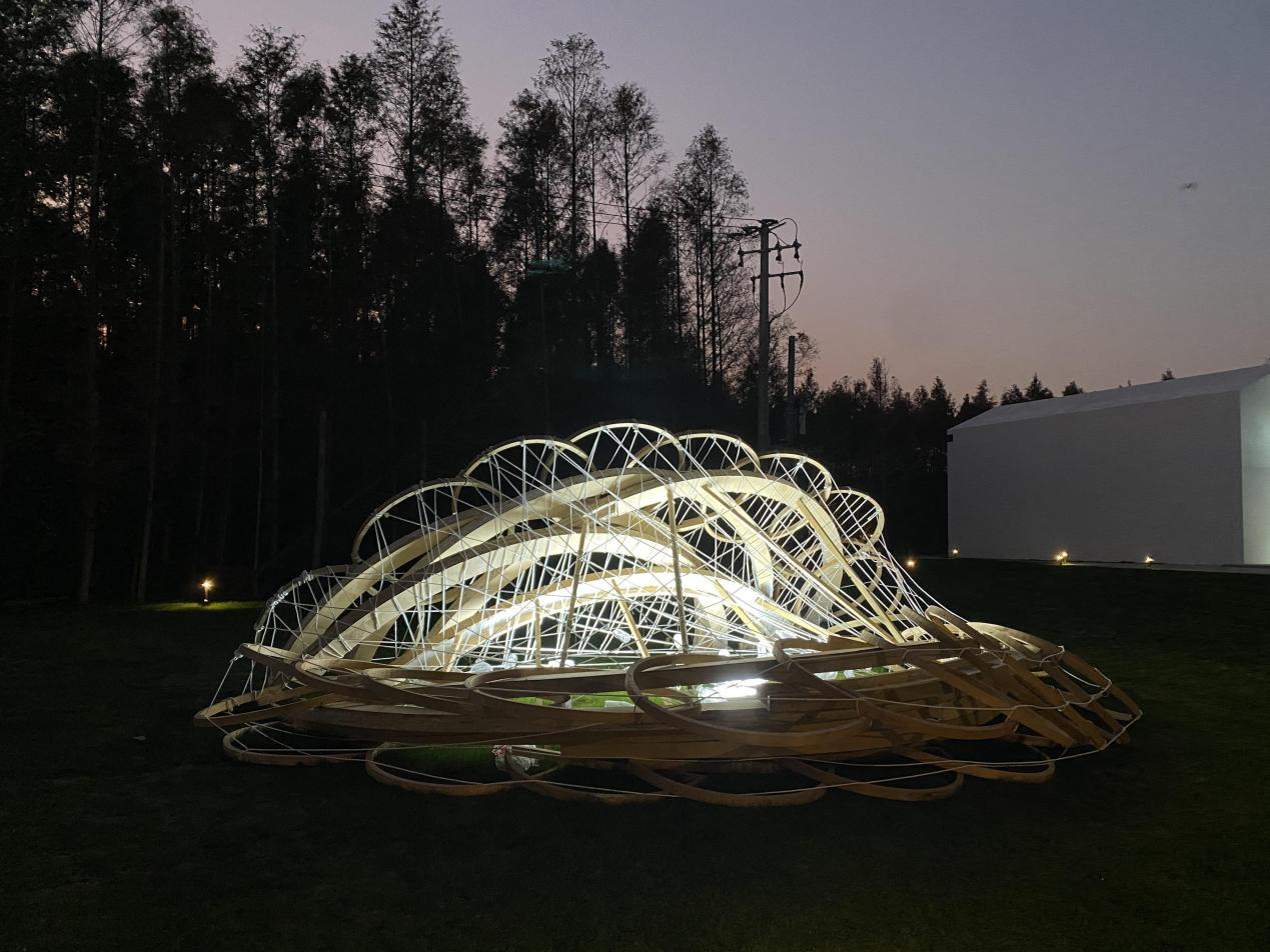 整个装置由木料麻绳和塑料瓶组成,当暮色降临,装置被点亮,宛如一个用星光勾勒出错落有致的银河,柔美静谧的散发着微光,成为香地艺术中心一处点睛之笔的存在。