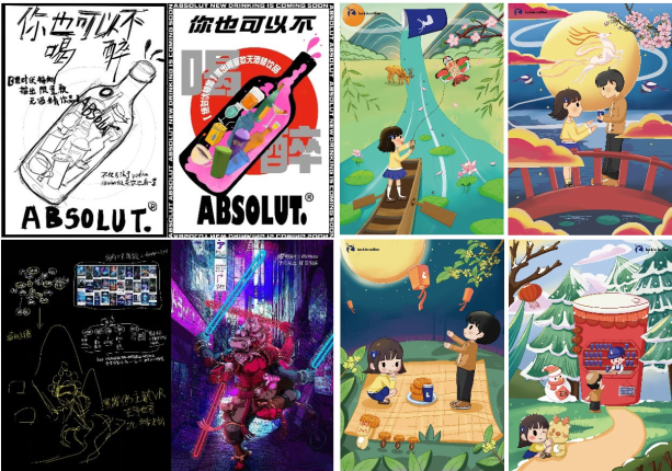 2022年12月,由视觉传达专业团队张鑫副教授、高鹏飞老师主讲的《平面广告设计》课程迎来的课程尾声。作为大三学生的专业核心课程,不仅在视觉的呈现上,“广告”也属于经济范畴,在这门课程开始之前,大三的同学们已经学习了《造型基础》《设计色彩》《装饰图案》《图形创意》《字体设计》《版式设计》《标志设计》《平面软件》等等的前置设计课程,经历了大学一年级、二年级两年的专业培养,拥有一定的设计基础和审美能力。以高鹏飞老师为例,从理论学习,使学生熟悉广告设计的基本内涵、溯源以及广告设计的基本流程,对广告概念形成一定的认识和自我的理解,对后期创意生成、视觉表现与形成商业思维有一定帮助。从创意阶段,开发同学们的创意思维,让同学们掌握前期企业调研、广告策略撰写、创意概念提取、思维导图训练和初稿的起草,为后期的视觉表现打下坚实的基础。从视觉表现上,广告设计从广告策略、创意概念和视觉表现紧密相连并不断深化;在平面广告设计课程的最后一个阶段,让同学们接触真实的广告项目,选择广告比赛进行平面广告真实项目设计,以赛促学,培养学生敏锐的商业思维和表现能力。