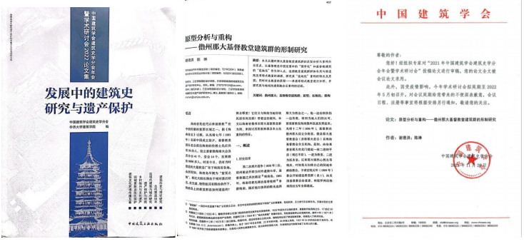 2022年,我院学生谢德洪论文《原型分析与重构—儋州那大基督教堂建筑群的研究》成功被录用在中国建筑学会建筑史学分会年会暨学术讨论。2019年为申请大学生创新创业大赛,谢德洪小组申报的《那大基督教教堂建筑群的保护与活化》课题有幸成功评为省级项目,这也正式拉开了谢德洪对儋州那大基督教堂建筑群的研究工作。一年后,在团队的协作下,为该课题撰写了论文《原型分析与重构—儋州那大基督教堂建筑群的研究》成功被录用在中国建筑学会建筑史学分会年会暨学术讨论会2022论文集中;2022年毕业季,谢德洪对该项目进行长达3万字的论文《乡村振兴视域下的海南传统聚落遗产保护与再利用—以儋州那大基督教堂建筑群为例》的撰写,荣获三亚学院优秀毕业论文二等奖,在2022年中旬,有幸受邀在厦门参加中国建筑学会2021年建筑史学分会年会暨学术讨论会。