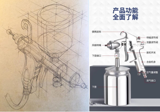 通过对优秀结构素描的临摹,了解气泵枪喷头内在结构,同时参考实物照片进行对比,由常规表象观察向内在结构观察过渡,锻炼学生主动去了解产品内在结构,空间结构。用准确的线条描绘该产品内在结构特点。