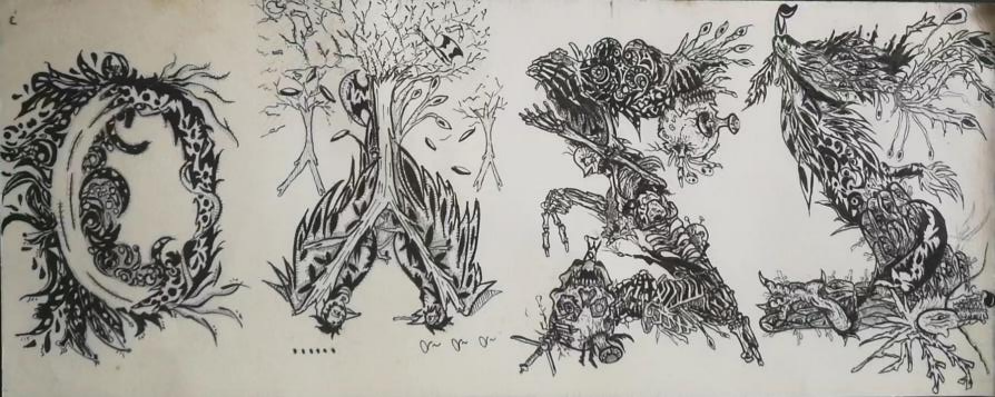 以黑白为基调创作。字母“O”自己凭空想的没有元素,字母“Y”借助人类砍伐树木的严重性为主题,土壤里的垃圾,光秃、干瘪的树枝,“不安分”的两只鸟等元素折射由此带的环境恶劣变化,想借此寓意减少森林破坏。字母第一个“Z”由元素一整具骷髅人体创作,并在此基础上添加“小鬼”元素,又利用了夸张的成分,比“耶”的骷髅手手势是它的亮点所在。而第二个字母“Z”利用一头龙,一尾凤,并在龙鳞和凤鳞的基础上打破原有的装饰,添了新元素:“各式各样的眼睛”而组成的一个龙凤“Z”的字体。