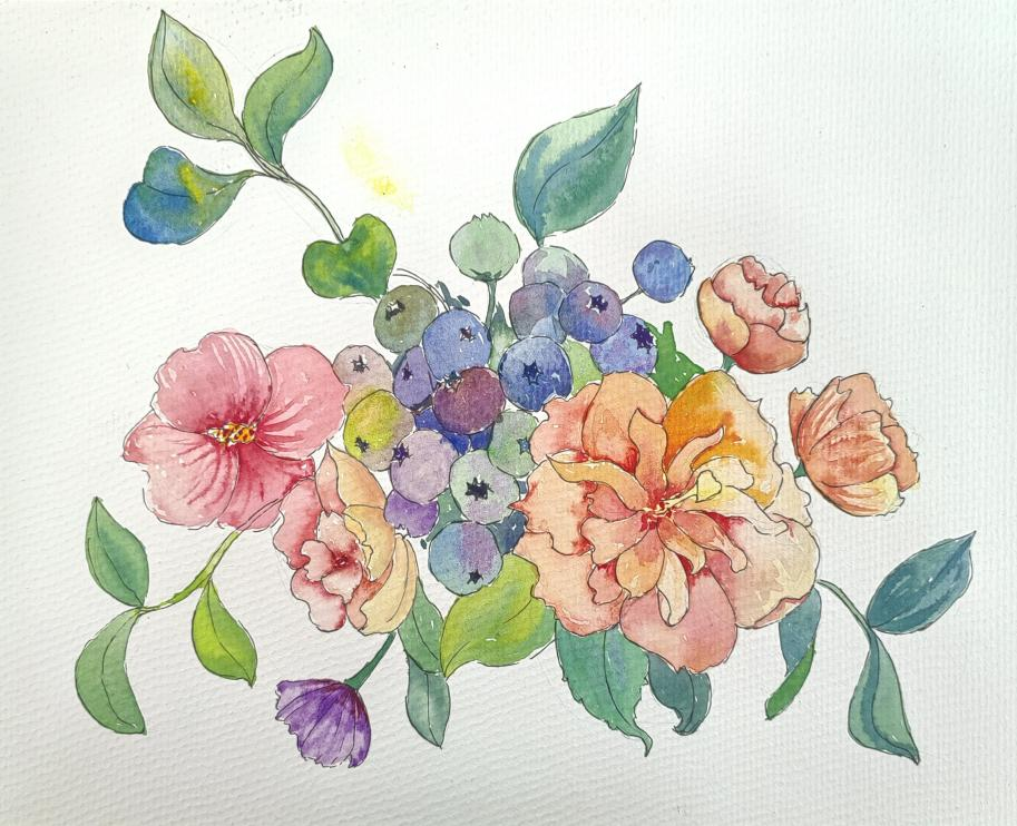 作品说明:蓝莓这一水果是因为同串的果子有这不同状态的生长规则,聚集状态的蓝莓有着整体性每个小果子又有独特性。我也选择了不同颜色、不同状态和不同朝向花朵去配合蓝莓。作为装饰画我运用高饱和度去表现植物的固有色,利用水彩以水作为媒介流动性强的特点也很好的表现了色彩的渐变与融合。在植物身上有许多色彩元素值得我们学习并运用到设计作品中,如月季蓝月石、绣球无尽夏还有景天科的多肉植物。正如同大家所说的:“大自然从不缺少美,只是缺少发现美的眼睛。”