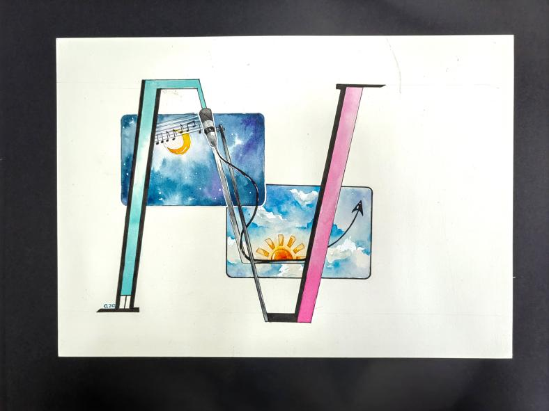 首先,本人预想出来的字母是“AZA”后来根据两个“A”的共性,排列组合了一下,其次本人所敬爱的人是热爱音乐的,本人也就加入了音乐的元素,同时麦克风元素旁边的音符也是根据歌曲的谱向绘制的,耳背后的两个关于白天和黑夜的背景卡,也是根据本人所敬爱的人们的生涯与昵称绘制,包含了本人对于他们的祝福,这个设计是十分中规中矩的设计,想到什么灵感就大胆的去绘制是非常重要的。