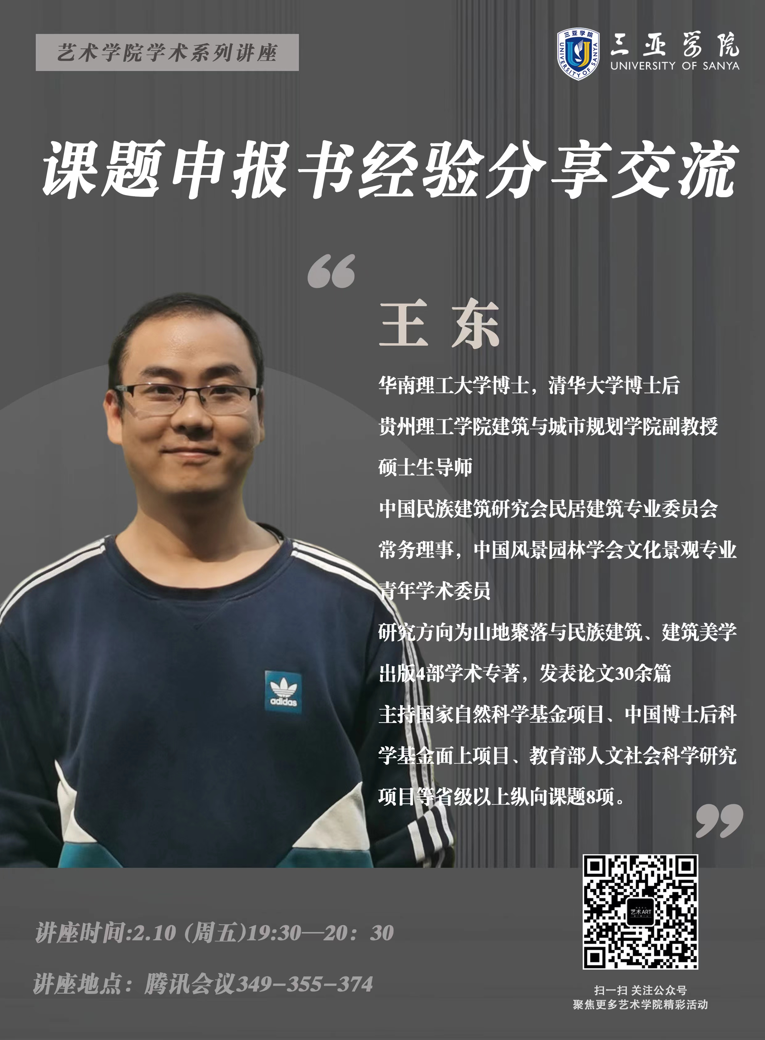 2023年2月10日晚7:30,名为“课题申报书撰写的经验分享”讲座在线上腾讯会议成功举办。主讲人是艺术学院特邀的清华大学设计学博士后、贵州理工学院建筑与城市规划学院副教授、贵州民族大学民族建筑方向硕士生导师王东先生。讲座由院长助理孙晋博老师主持,艺术学院和其他学院四十余名教师参加。讲座旨在通过王教授的经验分享使老师们能避免在课题申报书撰写过程中易范的错误,提高选题申报成功率。