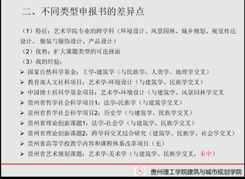 然后,王教授针对自然学科类、人文社科类、艺术学类、交叉学科类等不同类型的申报书的差异分享了自己宝贵的经验。王教授建议老师们遵循“爬楼梯”、“滚雪球”的原理:校级-厅局级-省级-部委级-国家级的顺序;“遵循降维打击”原理:高标准撰写,适时适地的申报不同级别课题。王教授重点分享了提高申报书命中的关键点和申报书撰写中各环节的重点。关键点一是积累;二是创新,申报的课题要有研究基础要体现在“专”上,而不是“广”上,创新是生命力的体现尤其重要。并指出选题不中的原因是基础弱、创新度低、方法缺乏针对性、不规范、认证不充分,对比之下申报书不中的关键一目了然。在申报书撰写各环节的重点中指出:首先要确定选题,可以从指南中选择;也可以从学院的特色方向选一个点,或者从团队成员已获批的大课题中析一个子课题;再就是做自己熟悉的对象,深耕一个领域。下一步,论证要“一一对应,环环相扣”让申报书整体连贯,逻辑清晰,主题高度集中;王教授用图表的方式列出了研究内容、研究方法、研究目标,在上面三点明确的基础上可以写创新点了。最后再写课题研究的意义。