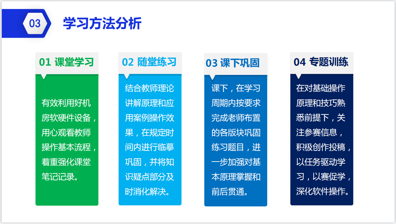 通过本次说课活动,每位专业教师对所教课程进行认真梳理和分析,提出了有效的课程实践改革策略,并互相提出了参考意见,对于课程的有效开展起到了很大作用。此类活动将在专业教学中持续开展。