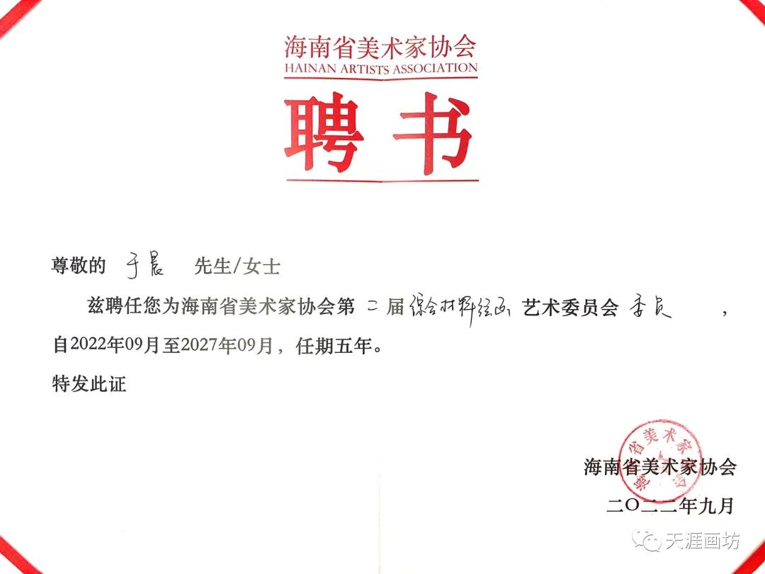 奋进新征程,建功新时代。在全省人民掀起学习贯彻党的二十大精神热潮中,为贯彻落实习近平总书记关于文艺工作的重要论述,进一步坚定文化自信,扎实推进海南美术事业繁荣发展,按照海南省美术家协会工作部署,2023年4月9日上午,海南省省美术家协会艺术委员会换届会议在省文联会议室召开。省文联副主席、省美术家协会主席阮江华、省美协副主席兼秘书长王锐、省美协常务副主席符祥康、省美协副主席林明俊以及省美协综合材料艺委会主任、副主任、秘书长、副秘书长和委员参加会议。我院于晨老师被聘为海南省美术家协会第二届综合材料艺术委员会委员。