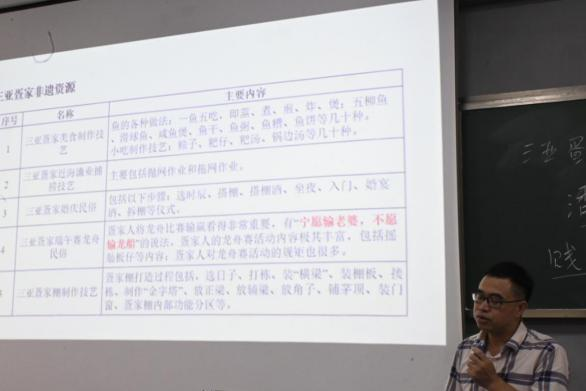 随后,冯博士为同学们介绍了疍家文化和三项“非遗”的保护现状,特别是遗存的20余项“非遗资源”。三亚南边海榆港社区和南海社区共建有“三亚疍家文化馆”,这便于人们现场体验疍家文化;海棠湾后海村有三家疍家海鲜店,还有一口古井、一棵老树以及一座老屋,这是海棠湾后海疍家社区不多的疍家文化标识,使“网红”在“打卡”游玩的同时也能受到疍家文化的熏陶;三亚疍家现有三项遗产被列入“非遗”保护项目,分别是:疍歌、海螺姑娘传说和赛龙舟。三亚“非遗”项目的保护,促进了疍家文化的传承。