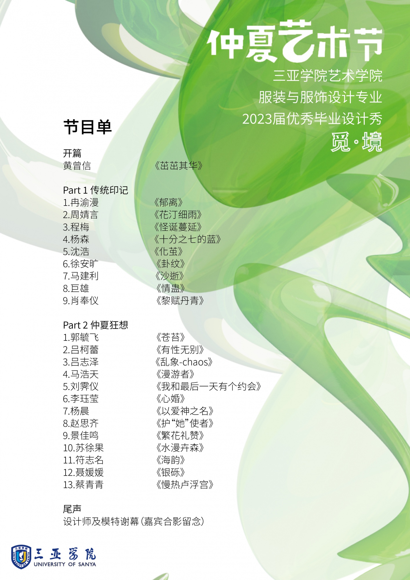 当晚六十多套优秀毕业设计作品参加走秀,其中大部分作品以海南本土文化元素作为创意灵感,结合当代审美眼光,利用现代剪裁方式来呈现,充分展示了海南本地文化的魅力和三亚学院服装专业学生们的创作能力。当晚的走秀分三个部分。开场为童装秀,当儿童的天真与年轻设计师的创意相遇,奇妙的化学反应由此产生;上篇“传统印记”,以民族民俗元素为创意主题,营造出一种独特的时尚民族风情;下篇“仲夏狂想”是一个充满创意和浪漫的主题,设计师们以创意服饰和婚纱礼服为载体,大胆且奔放的表达彰显着年轮人的不羁与豪情。
