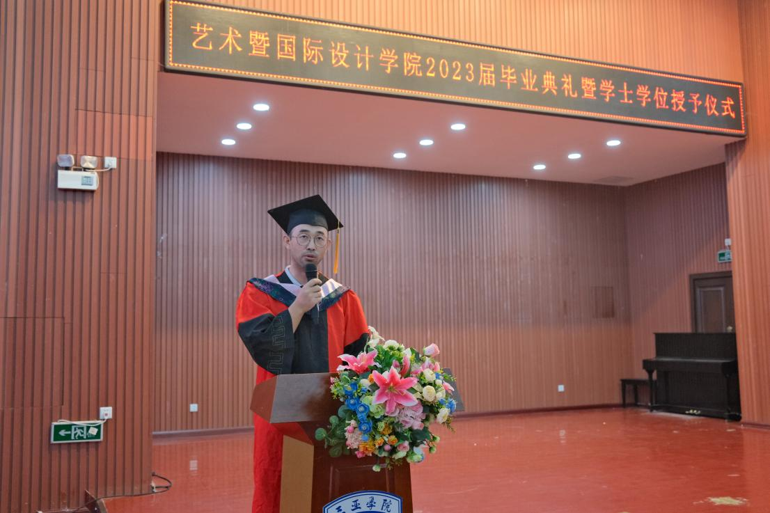 由艺术暨国际设计学院常务副院长陈琳教授为23届毕业生们致辞,对毕业生们表示祝贺,对辛勤培养同学们的老师们表示感谢。致辞中表示:“这场典礼是毕业生们人生中难以忘怀的一次阶段闭幕。这届毕业生们拥有着不平凡的四年学习生涯,人工智能的快速发展,让教学方式从线下讲台迁移到了网络课堂,深刻体验到了人工智能,信息时代所带来的改变。学院通过自己的方式,让学子们更好的从校园中走进社会,感受时代风向,积极发挥所长。学子们也应在面临更多挑战和机遇时不忘初心,不惧艰难,自信坚韧的达成自己的目标,不留遗憾。”