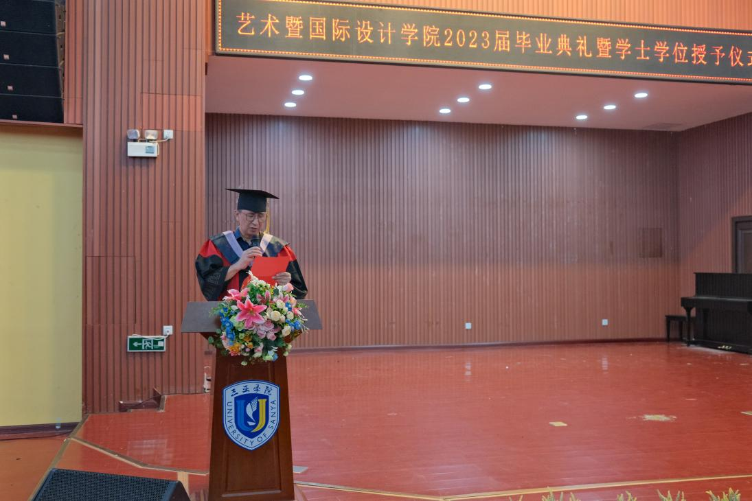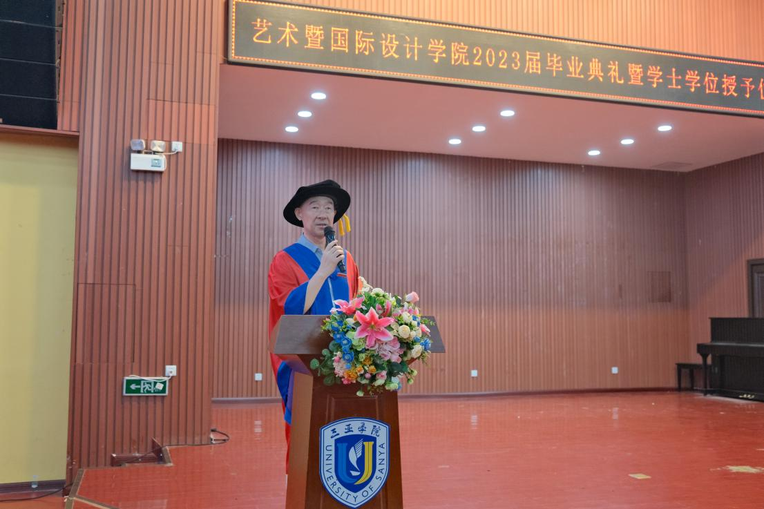 三亚学院副校长刘晓鹰教授向2023届毕业生致辞,教授引用了吉利集团李书福董事长的讲话,提出人工智能时代的到来,同学们应敏锐的感知到其势头之大不容小觑。要如何把控人工智能为己所用,将其运用在设计领域,渗透进工作生活之中是当今时代前沿的热门话题。又提出设计也应回望世界文化遗产的保护与发扬,将设计植根于世界文化遗产肥沃的土壤中,通过设计让文化遗产绽放出其新的生命活力,增添新的文化色彩。