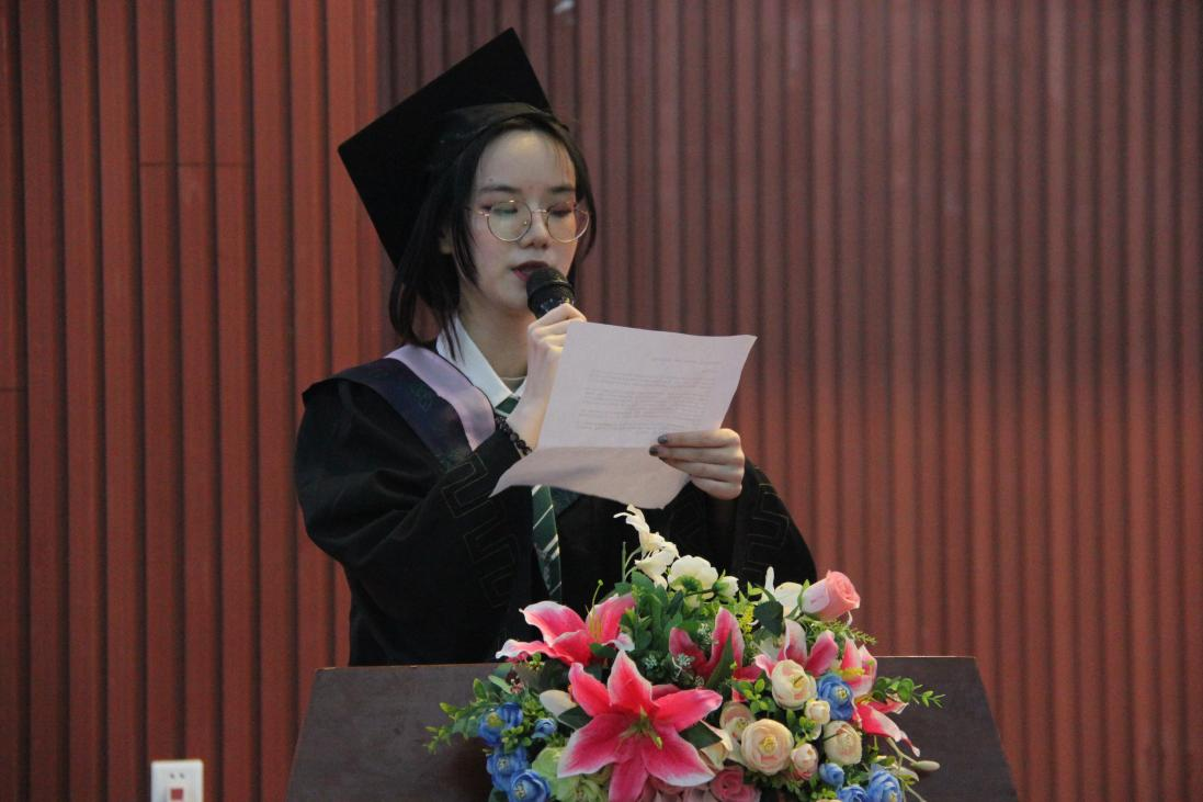 祝访语同学作为毕业生代表发言,表达了对母校四年栽培的感谢,对老师们孜孜教诲的感恩以及对一同奋斗上岸的同学们的美好祝愿。