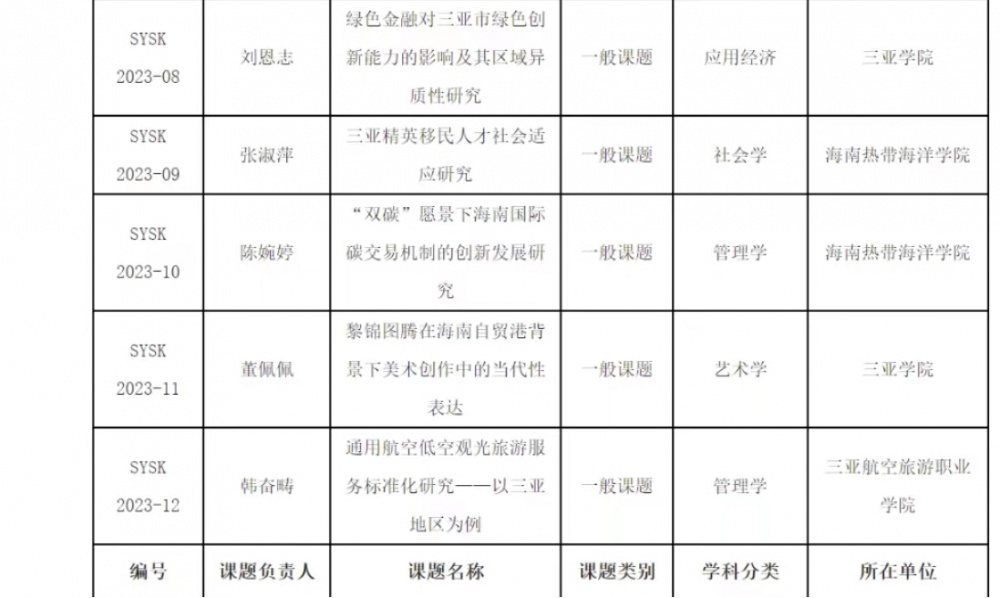 据悉,今年在三亚所有高校和科研机构中,我校取得了最好的成绩,全市共25项课题拟获三亚市2023年度哲学社会科学资助课题,其中三亚学院研究课题共9项获得立项,数量稳居全市第一。