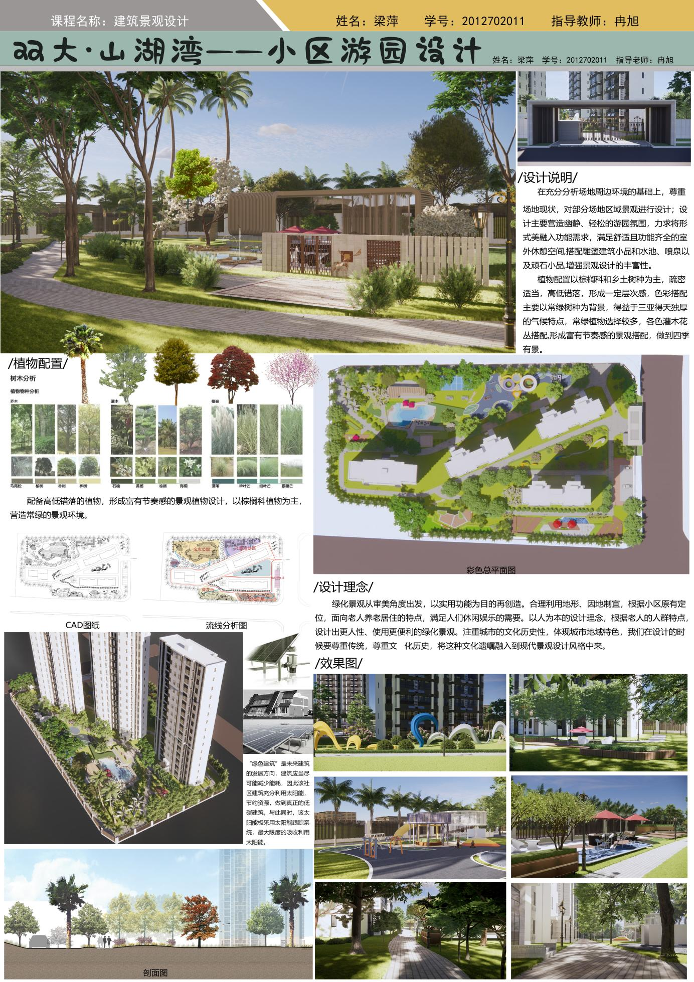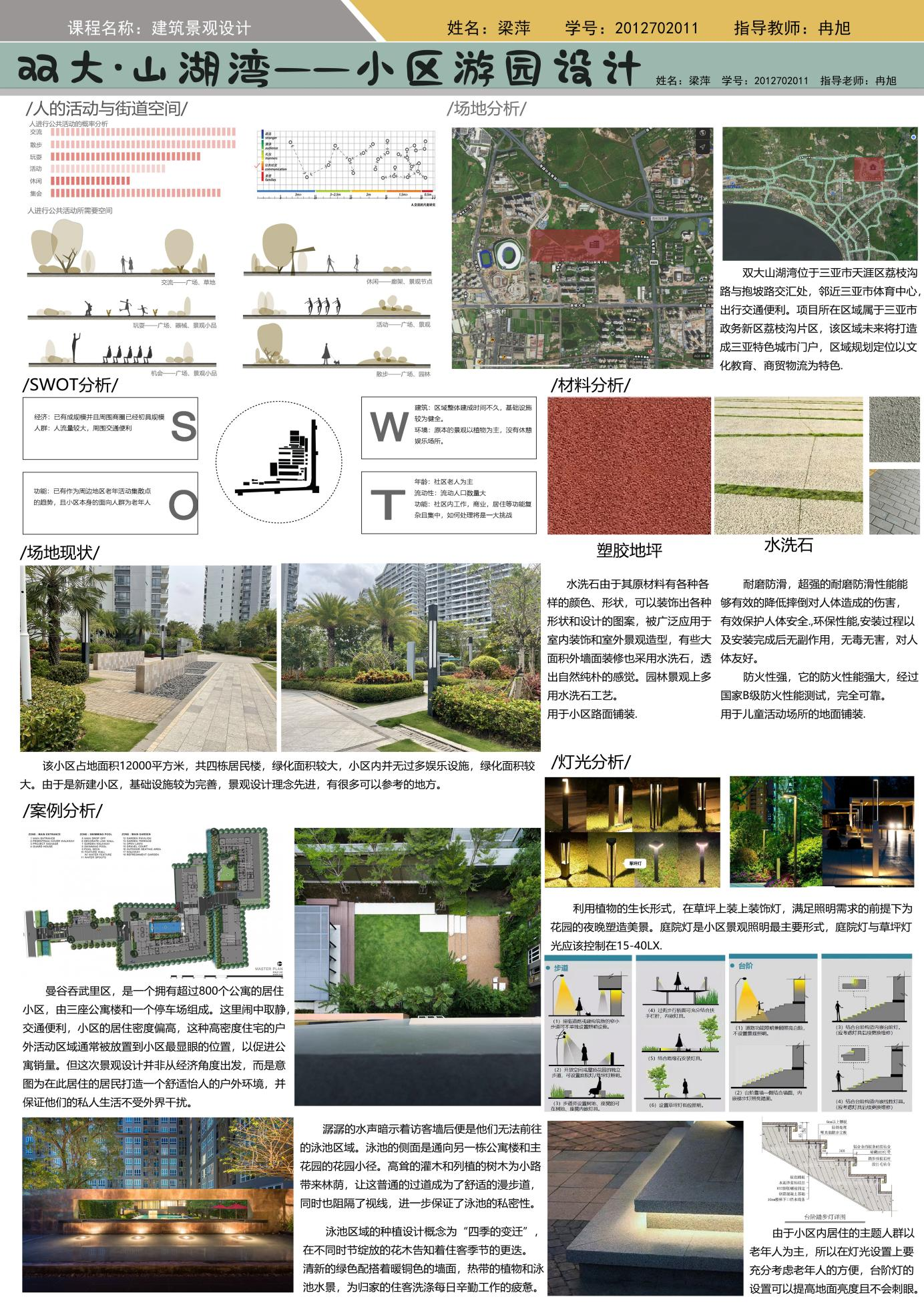设计本身是一个从无到有,从模仿到创新的过程,在冉旭老师的引导下,我们在建筑景观设计课程中,从初步接触景观设计,到对于各类景观有了一定程度的分析思路,再到对于各种不同环境中景观的借鉴与模仿,最后到自主设计中出现的创新,这些都是建筑与景观设计课程带给我们的收获。