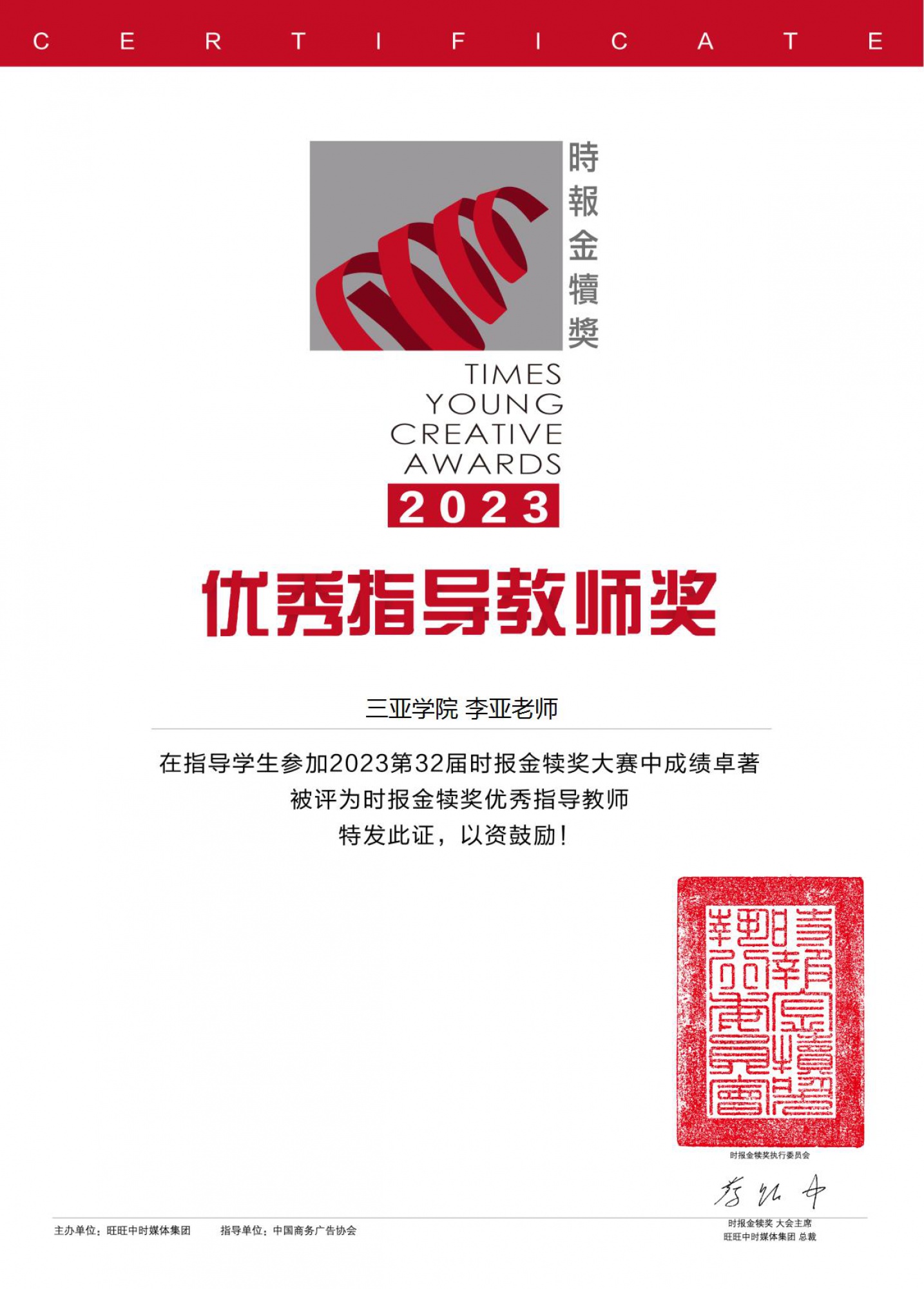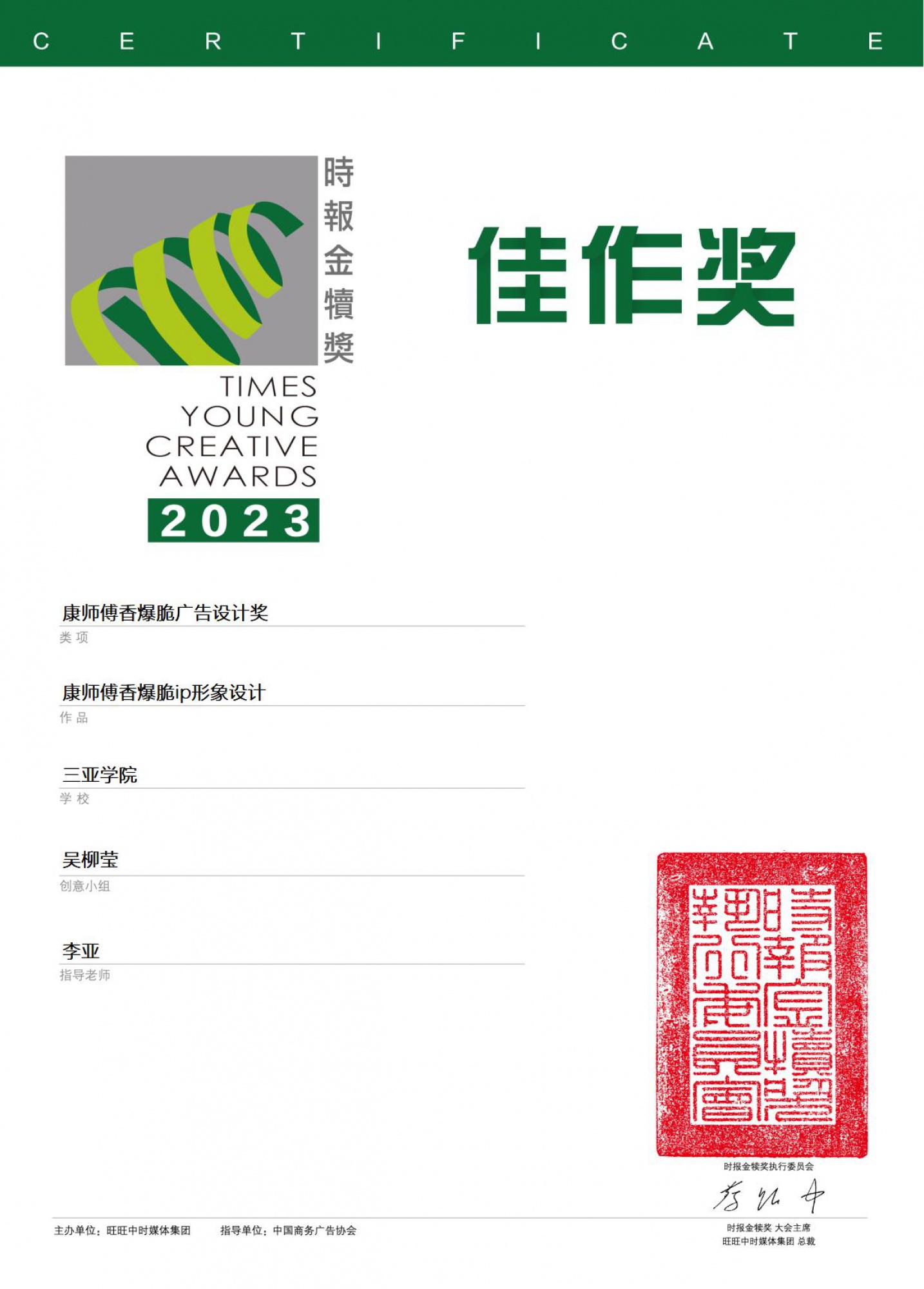 品牌课堂中学生满腹热血参加比赛,积极实践课堂所学。在李亚老师的指导下对参赛学子进行辅导,帮助他们顺利迈向金犊舞台。国际设计学院视觉传达专业2001班更是在时报金犊奖比赛中荣获一名佳作十名优秀奖的好成绩。