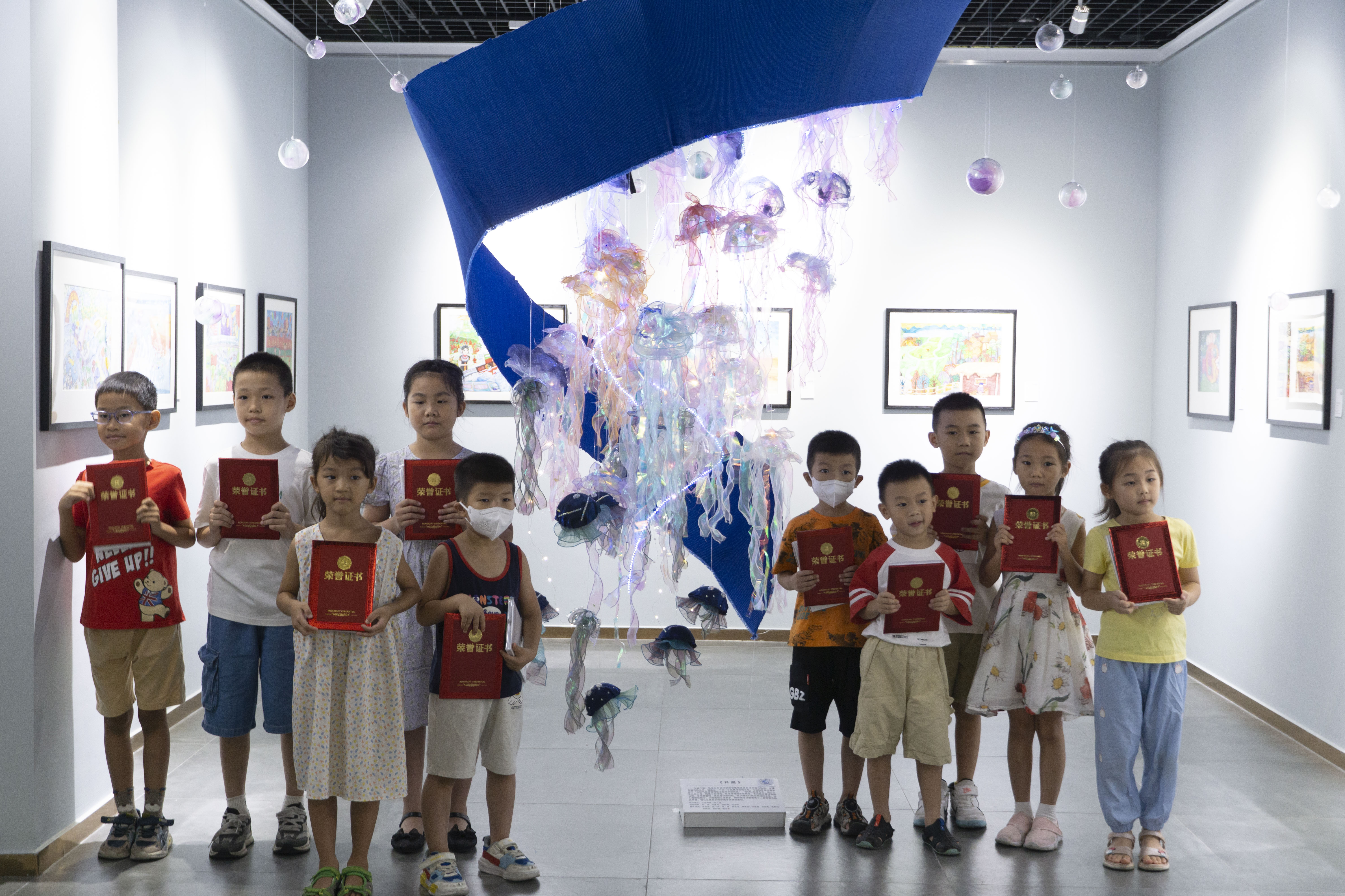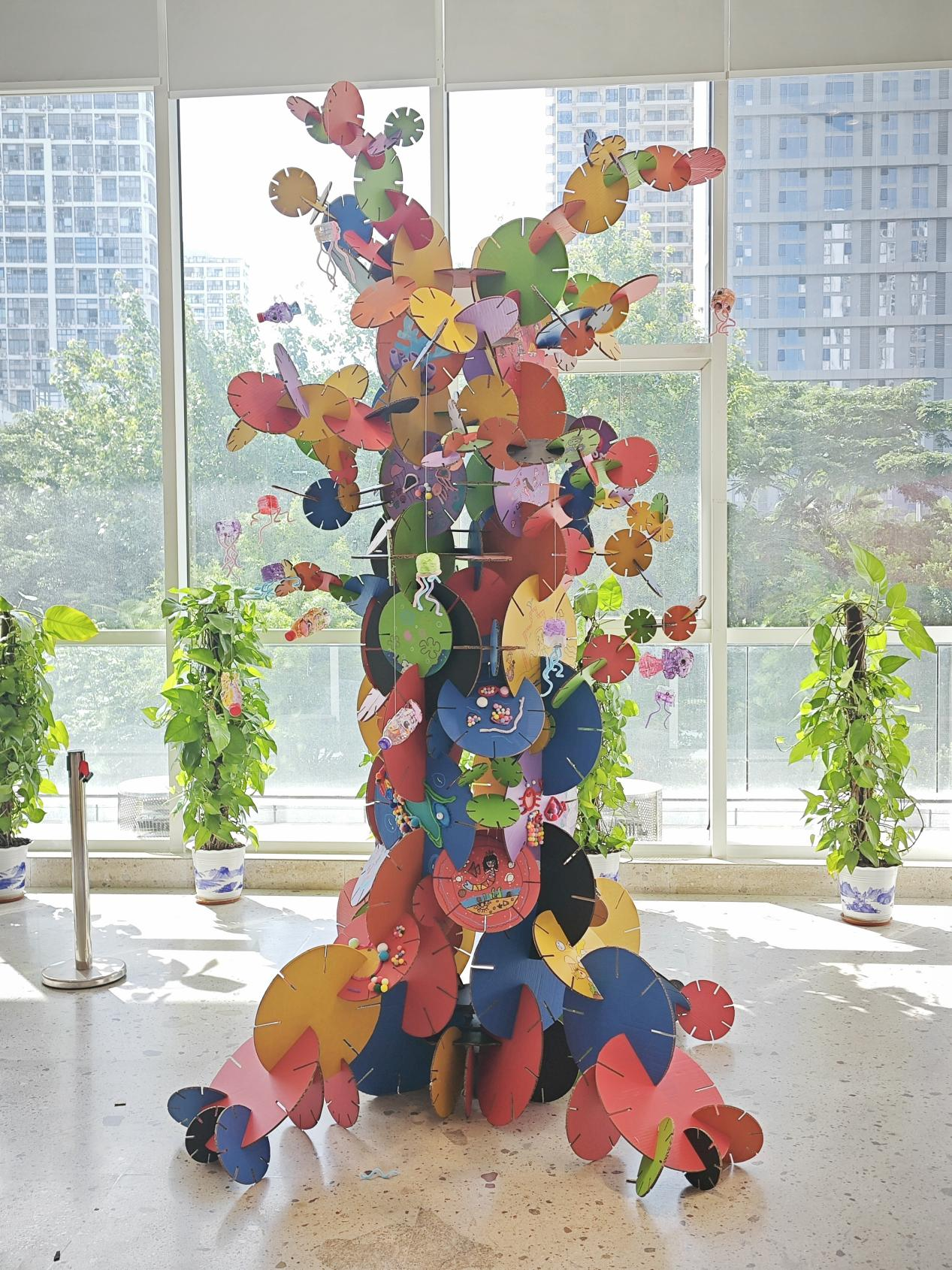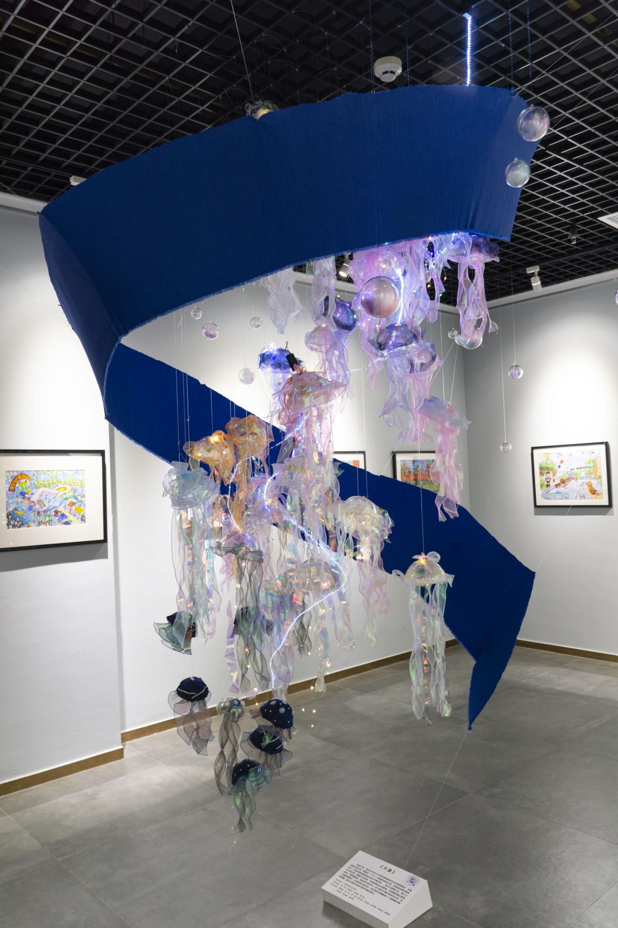 作品介绍:海洋对于孩子们而言是绚丽多彩且充满神秘的,充满创造力的小手,制造出一个又一个别具特色的水母。作品创作想法是来自于“全球气候变暖导致水母无节制泛滥”;我们以数量为主,用大大小小的水母,制造中心结构,形成密集的水母群体。本次制作通过使用丝带、可降解塑料,铁丝等环保材料。将小朋友们制作完成的水母,挂入集群装置中,从而告知小朋友们,保护海洋环境是每个人都需要去做的事情,树立小朋友们保护海洋环境的意识。