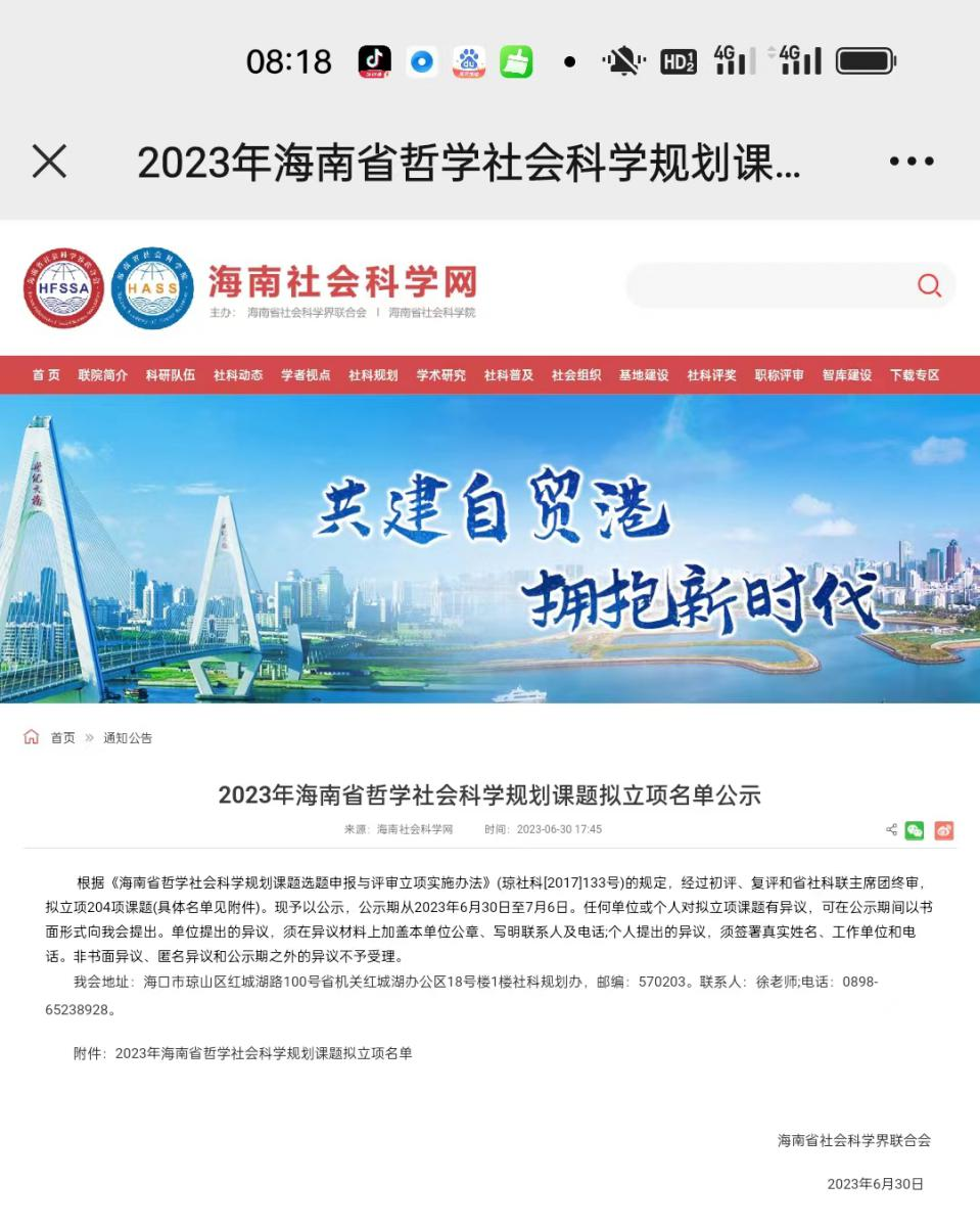 2023年6月30日,经过专家层层评审,我院冯建章老师的《海南港口史》研究课题,获得了2023年度海南省社科联立项。