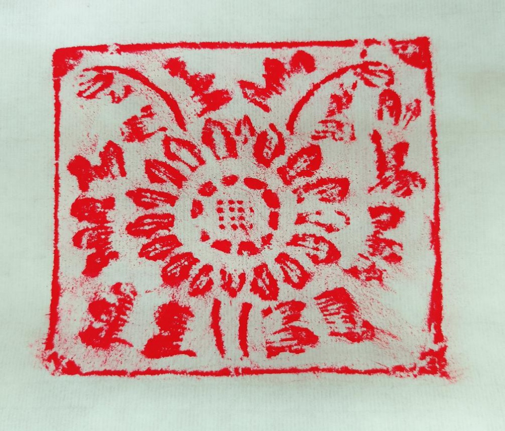 拓印实践课程旨在让学生通过对传统木雕纹样的深入观察和感知,并通过拓印的方式进行表达,尽可能地将木雕的传统纹样拓还原于纸面上。在拓印实践过程中,老师向学生们展示了传统拓印的技巧过程和方法,师生双方不断地尝试拓印的新方法、新材料,最终采用了墨汁拓印和油画棒拓印这两种方案。同学们很快就进入状态,运用所学技法,结合自己的创意和观察视角,发挥出自身优势,拓出古香古色的传统木雕拓印纹样。