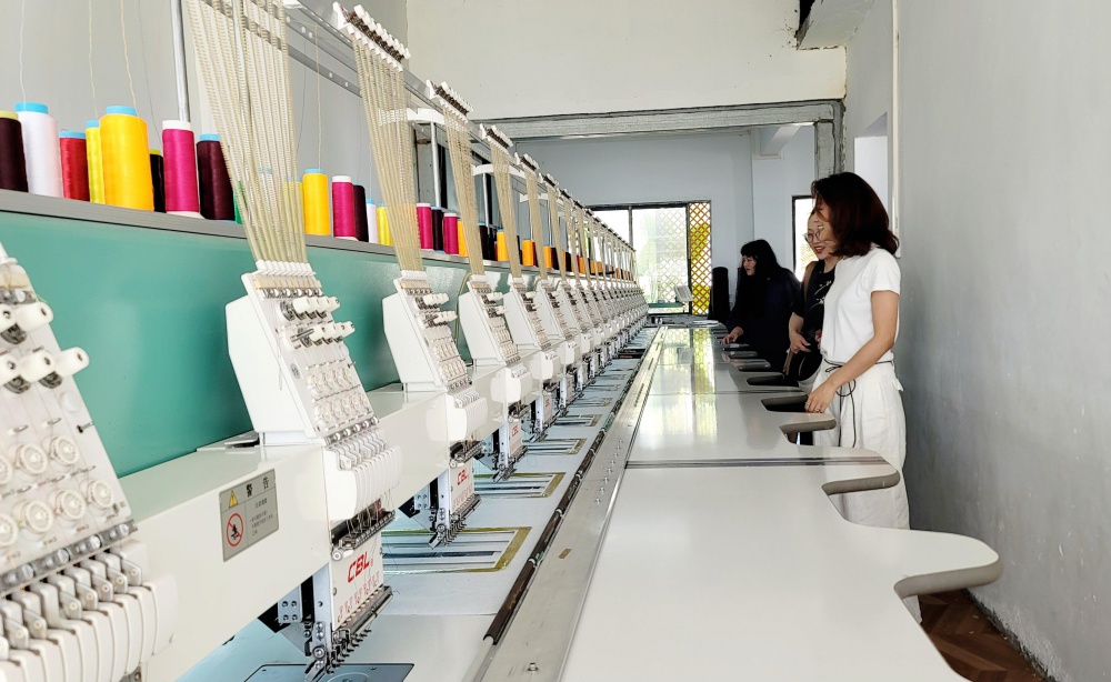 三亚黎族故事文化产业园是一个集文化传承、旅游体验、服装设计、黎族文创产品设计与展示于一体的综合性园区。园区内设有黎族文化展览馆、黎族服饰设计工作室、黎族手工艺品制作车间等多个功能区域。这些区域不仅可以展示黎族文化的独特魅力,还能为学生们提供实践的场所。黎族故事品牌负责人带领老师们参观了企业的生产车间和仓库,详细了解了服装的设计、裁剪、缝制和包装等工序。在参观过程中,企业的技术人员向老师们展示了最新的生产技术和设备,如电脑辅助设计系统、自动裁剪机等。