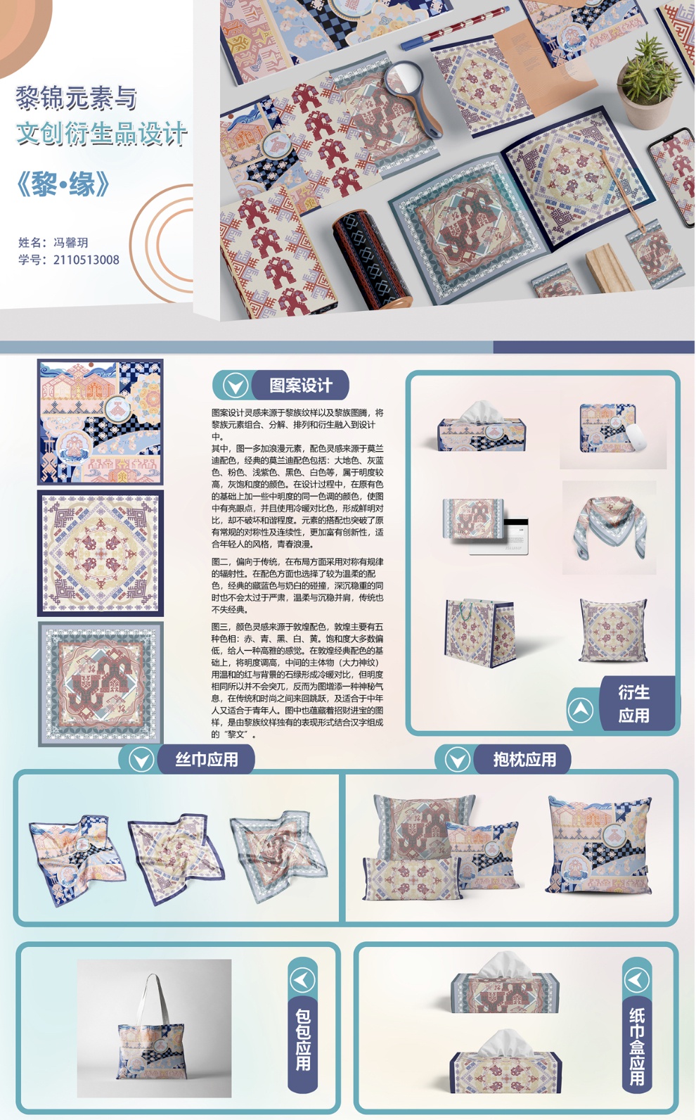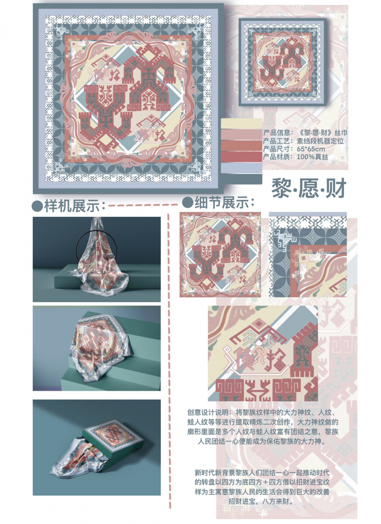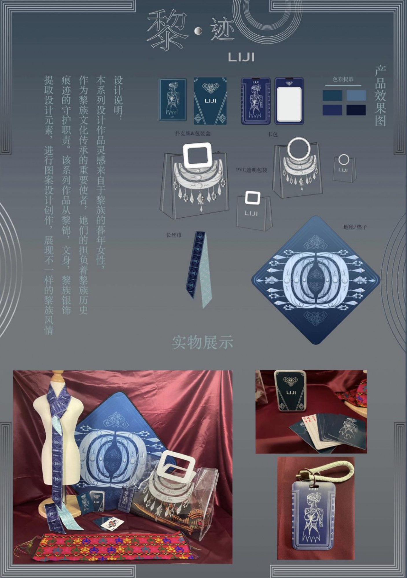 作品介绍:本系列设计作品灵感来源于黎族的暮年女性,作为黎族文化传承的重要使者,他们担负着黎族历史痕迹的守护职责。该系列作品从黎锦、纹身,黎族银饰提取设计元素进行图案设计创作,展现不一样的黎族风情。