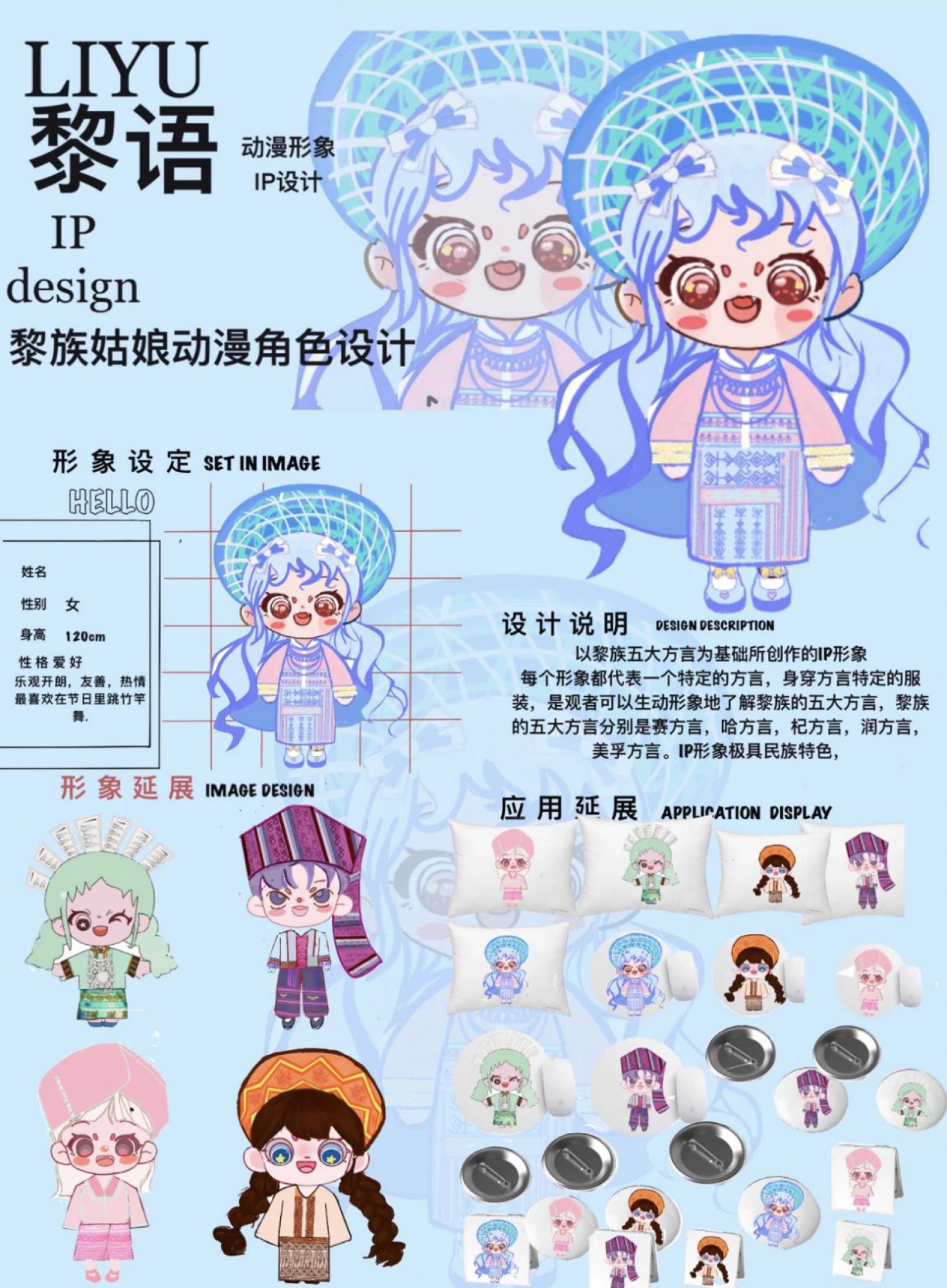 作品介绍:以黎族五大方言为基础所创作的IP形象每个形象都代表一个特定的方言,身穿方言特定的服装,是观者可以生动形象地了解黎族的五大方言,黎族的五大方言分别是赛方言,哈方言,杞方言,润方言,美孚方言。IP形象极具民族特色。