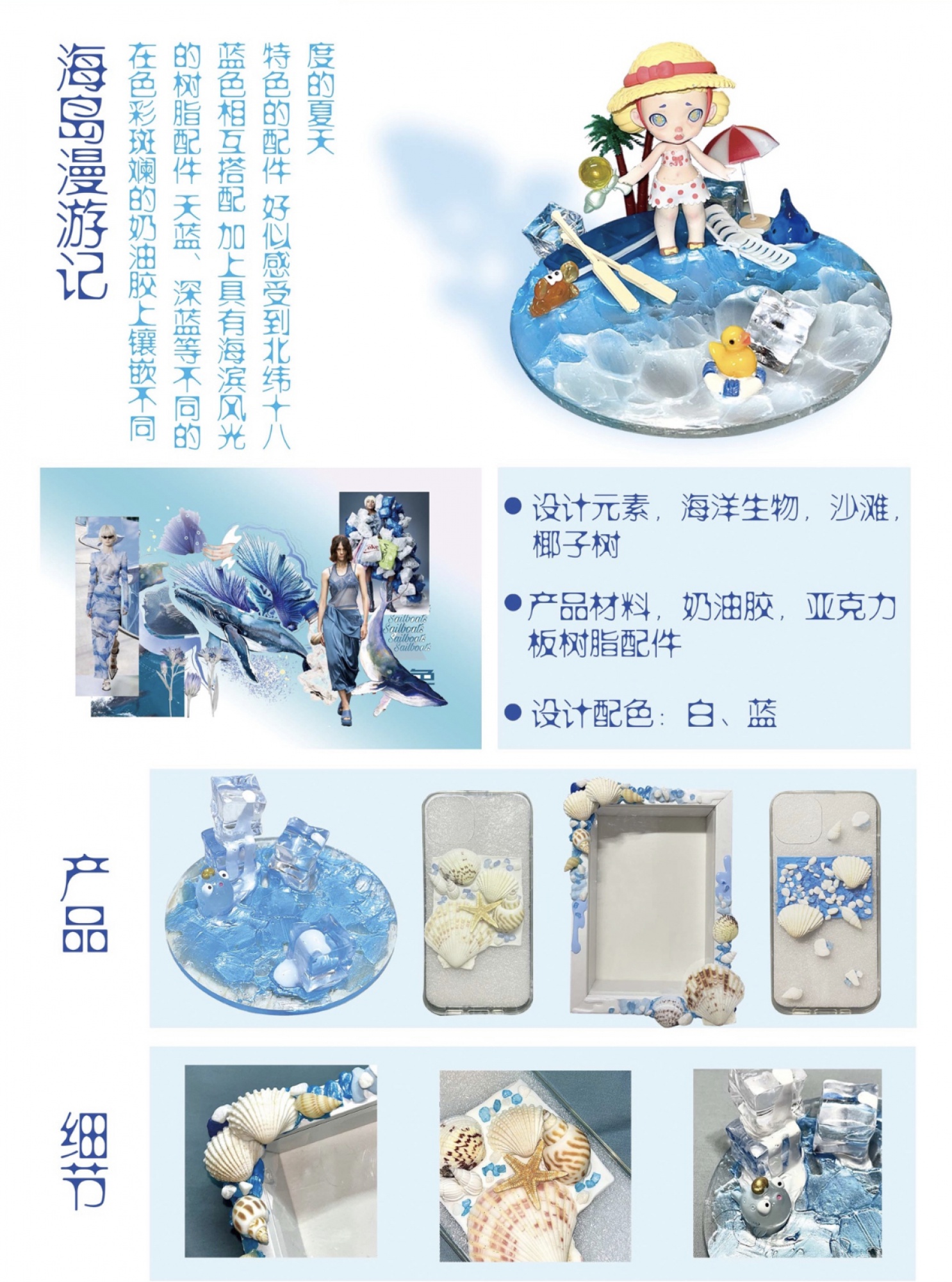 作品介绍:在色彩斑斓的奶油胶上镶嵌不同的树脂配件。天蓝、深蓝等不同的蓝色相互搭配加上具有海滨风光特色的配件好似感受到北纬十八度的夏天。