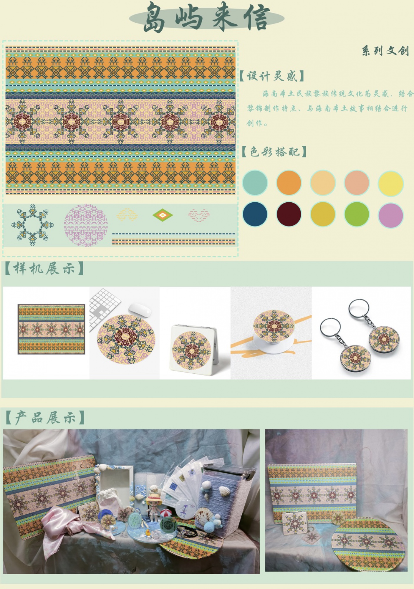 作品介绍:以海南本土民族黎族传统文化为灵感,结合黎锦制作特点、与海南本土故市相结合进行創作。