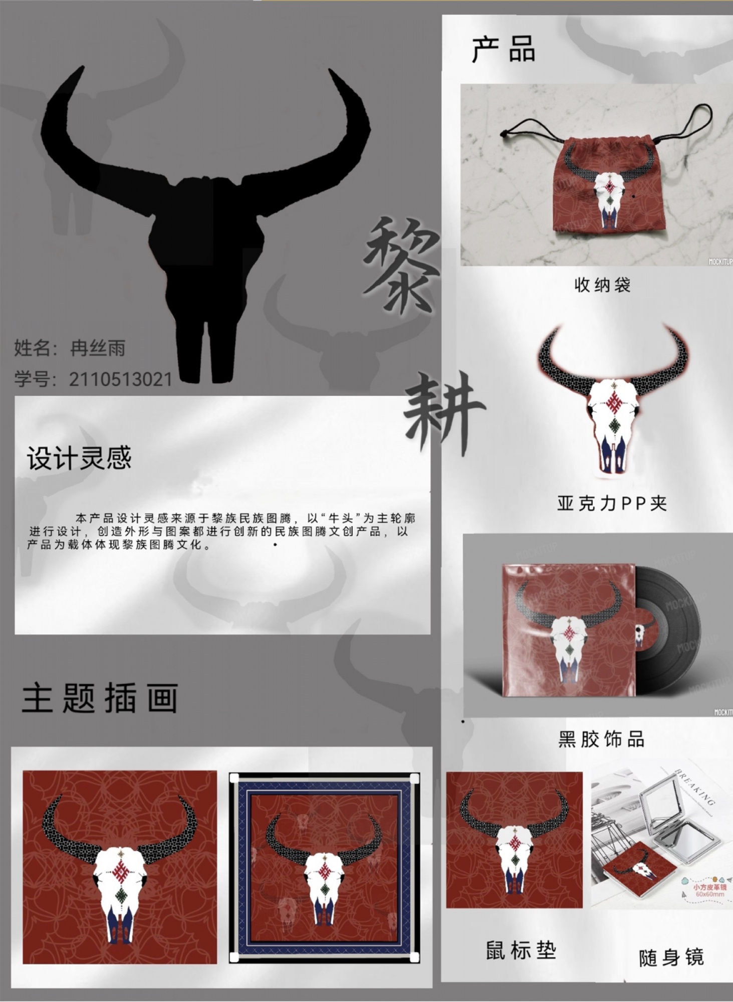 作品介绍:本产品设计灵感来源于黎族民族图腾,以“牛头”为主轮廓进行设计,造型外观与图案都进行创新的民族图腾文创产品,以产品为载体体现黎族图腾文化。