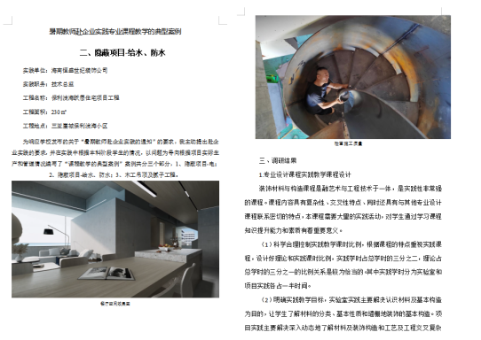徐老师在深入企业生产一线工作调研活动中,通过六周的企业实践,根据本科阶段学生的情况,以问题为导向,根据项目实际生产和管理情况撰写了可供专业课程教学的典型案例及实践总结报告,并对专业人才培养方案提出修订建议。