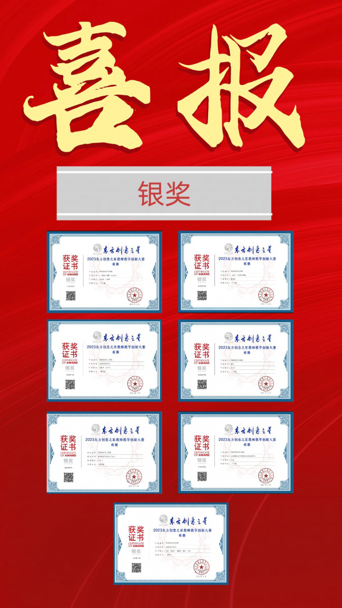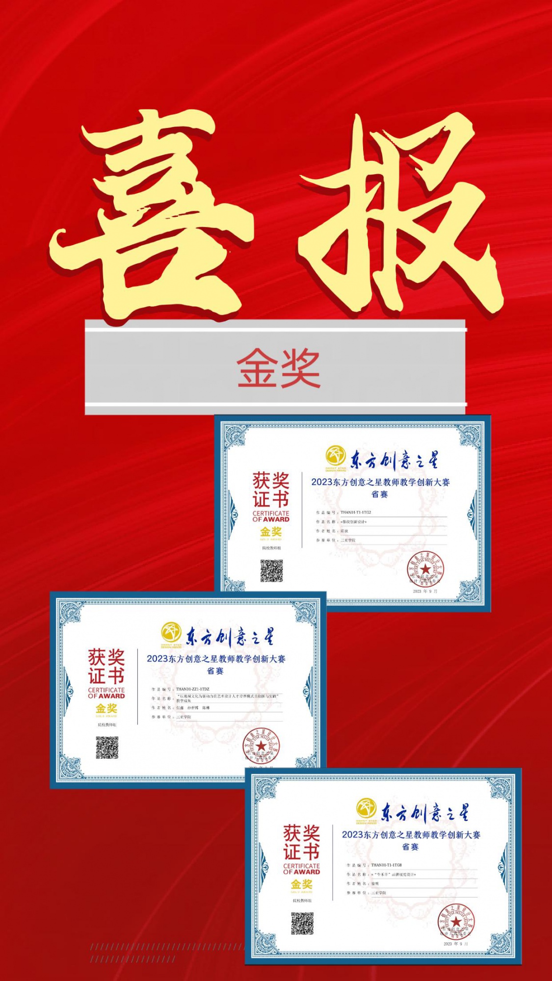 近日,由工业和信息化部国际经济技术合作中心批复举办的第四届东方创意之星教师教学创新大赛全国总决赛获奖名单正式揭晓,国赛赛道我院共获得三银七铜,省赛赛道我院共获得三金七银十二铜的佳绩!