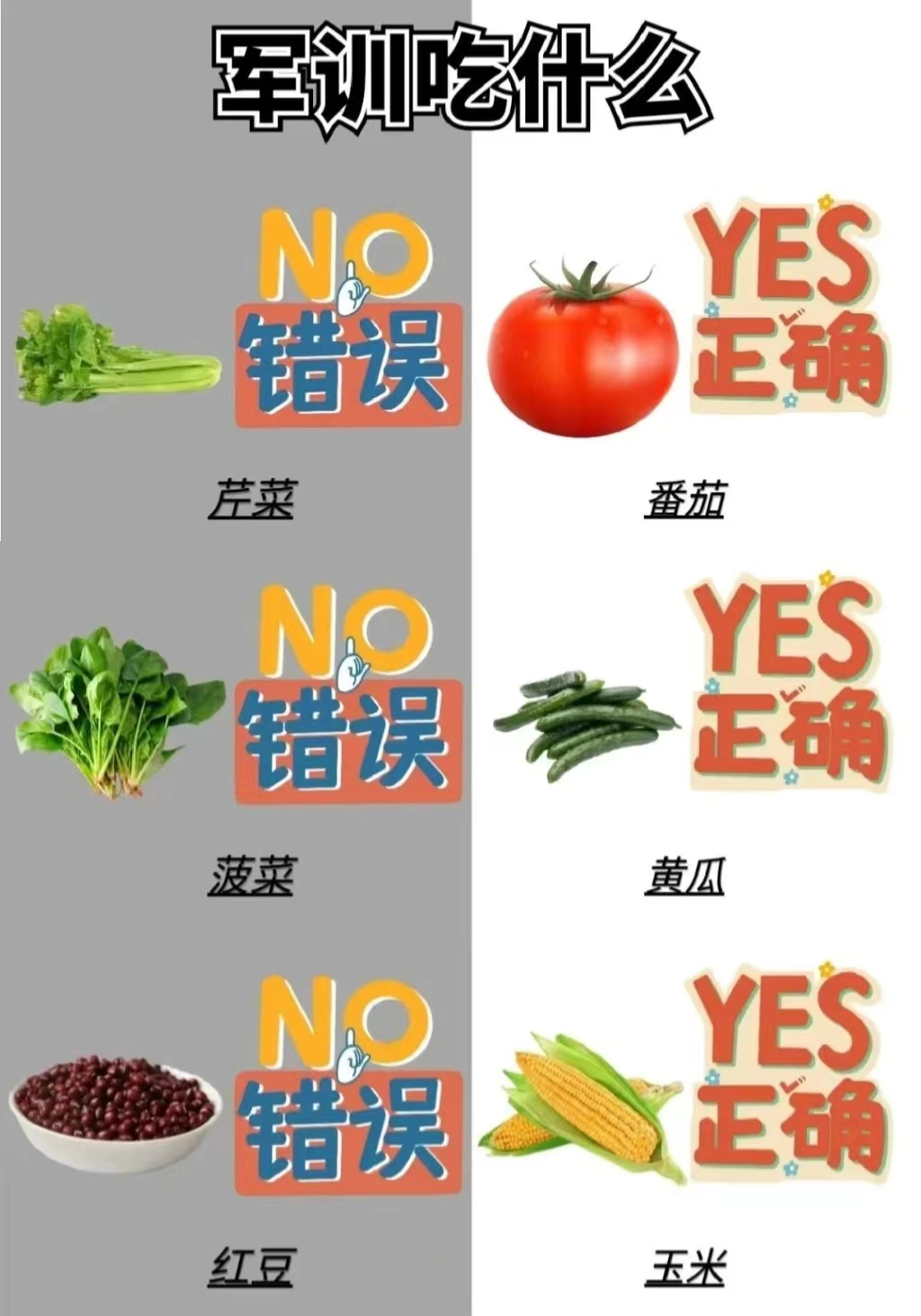 军训的时候不要吃油的腻的辣的东西,肉当然要吃,但别频繁补充太多,不然每天那样出汗,暴晒,毛孔被汗液、灰尘、油脂、还有防晒霜堵住,再加上这些刺激的食品的话,不长痘也难。