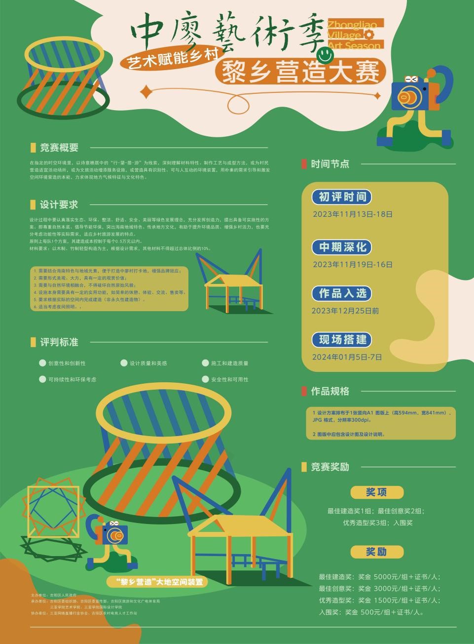 材料要求:以木制、竹制轻型构造为主,根据设计需求,其他材料不得超过总体比例的10%。