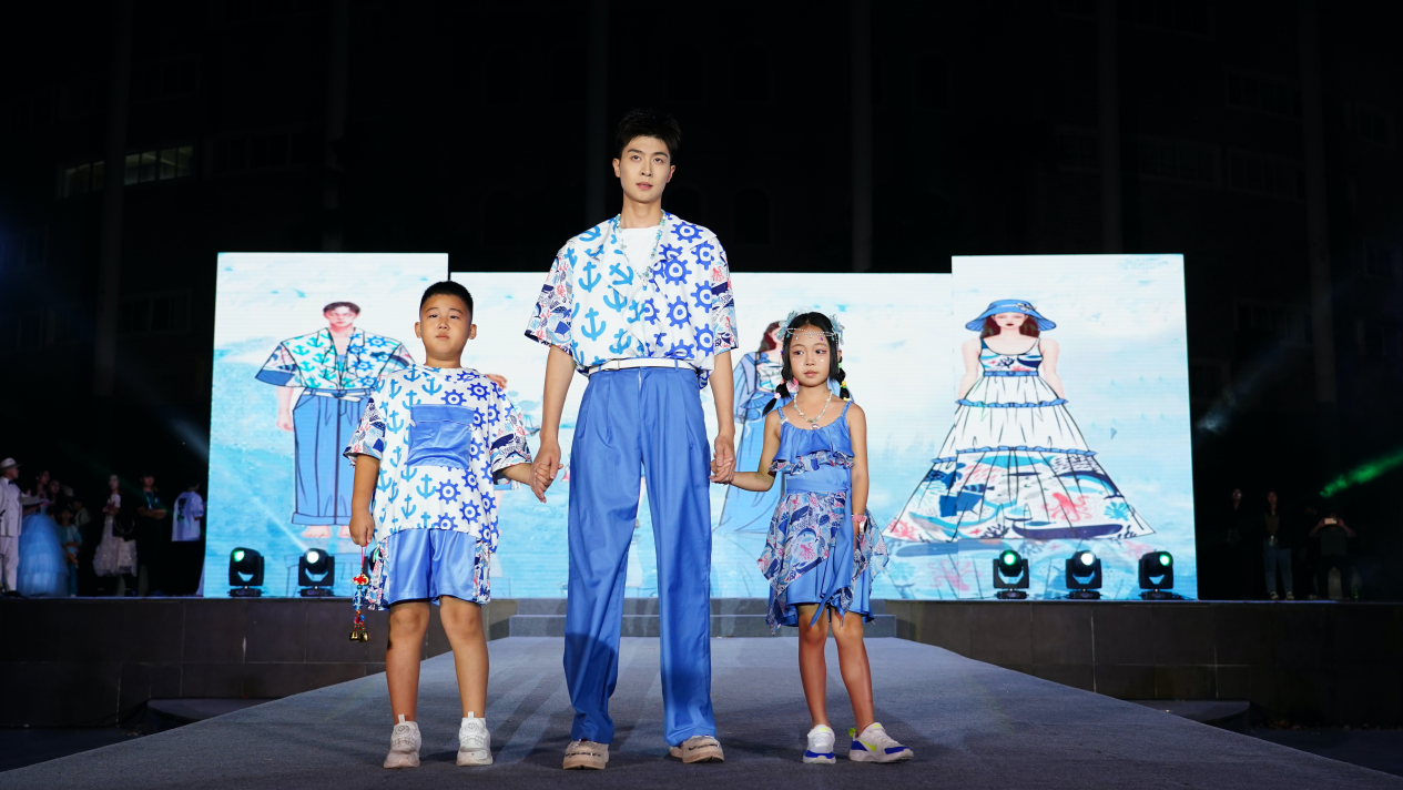 设计说明:本系列亲子装以“海洋之心”为主题,旨在展现海洋的浪漫、深邃和广阔,蓝色代表海洋,白色代表海浪,给人一种清新、自然的感觉。“海洋之心”亲子装将呈现出清新、自然的海洋风格,同时加入了实用的功能性设计,让家长和孩子们在穿着时能够感受到舒适和便利,强调家庭与海洋的和谐共处。