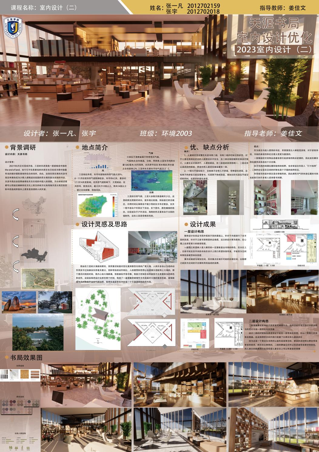 例如《室内设计(二)》课程以天涯书局改造作为商业空间设计的案例,学生们通过对现场的勘测、周围环境的实地考察,深入分析了区域因素、环境因素、人流与客流量、商业功能与文旅功能等多方面的设计因素,设计规划了整个书局的改造项目。本课程引导学生独立思考,提高了学生分析问题和解决问题的能力,锻炼了学生实际操作能力。