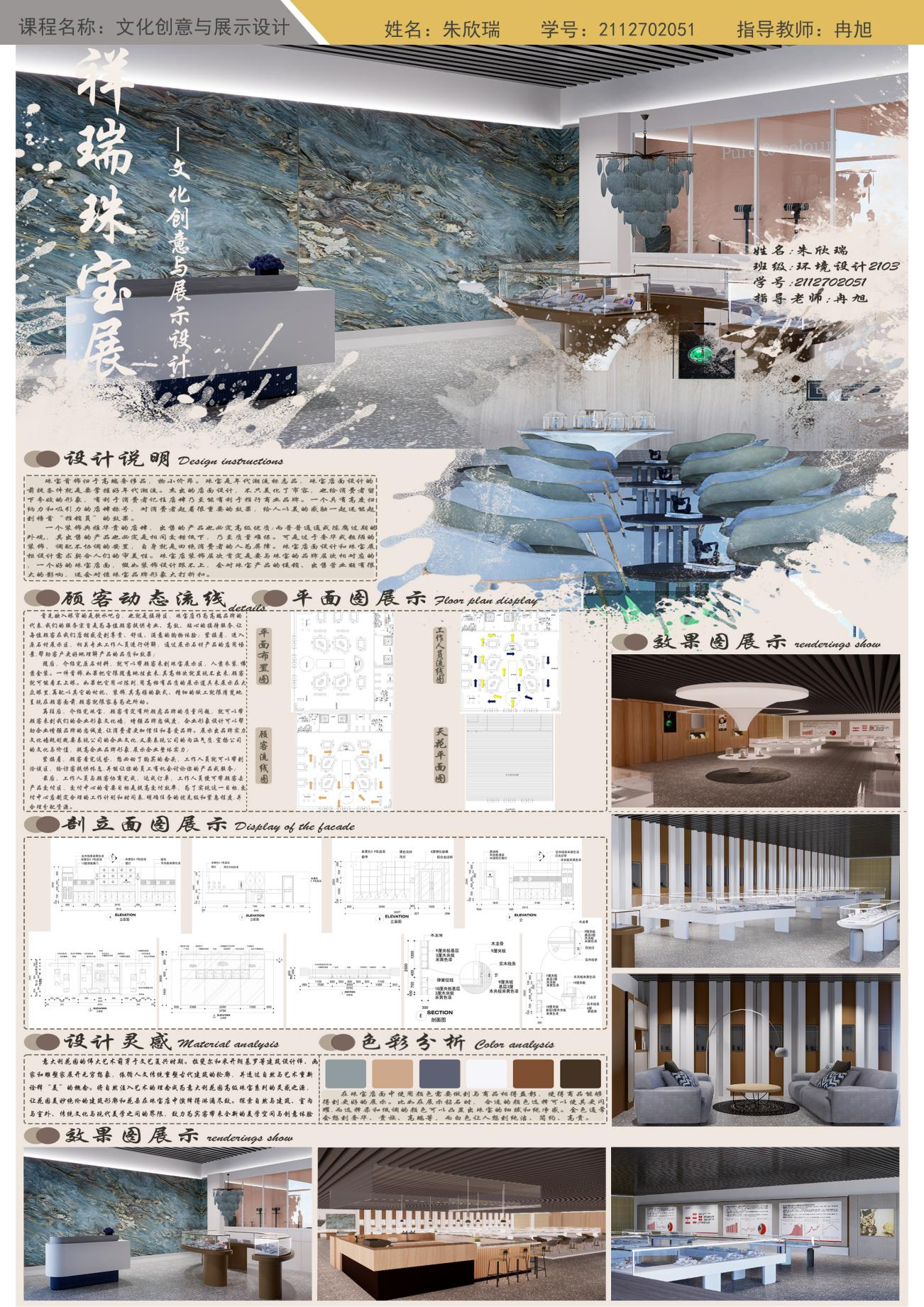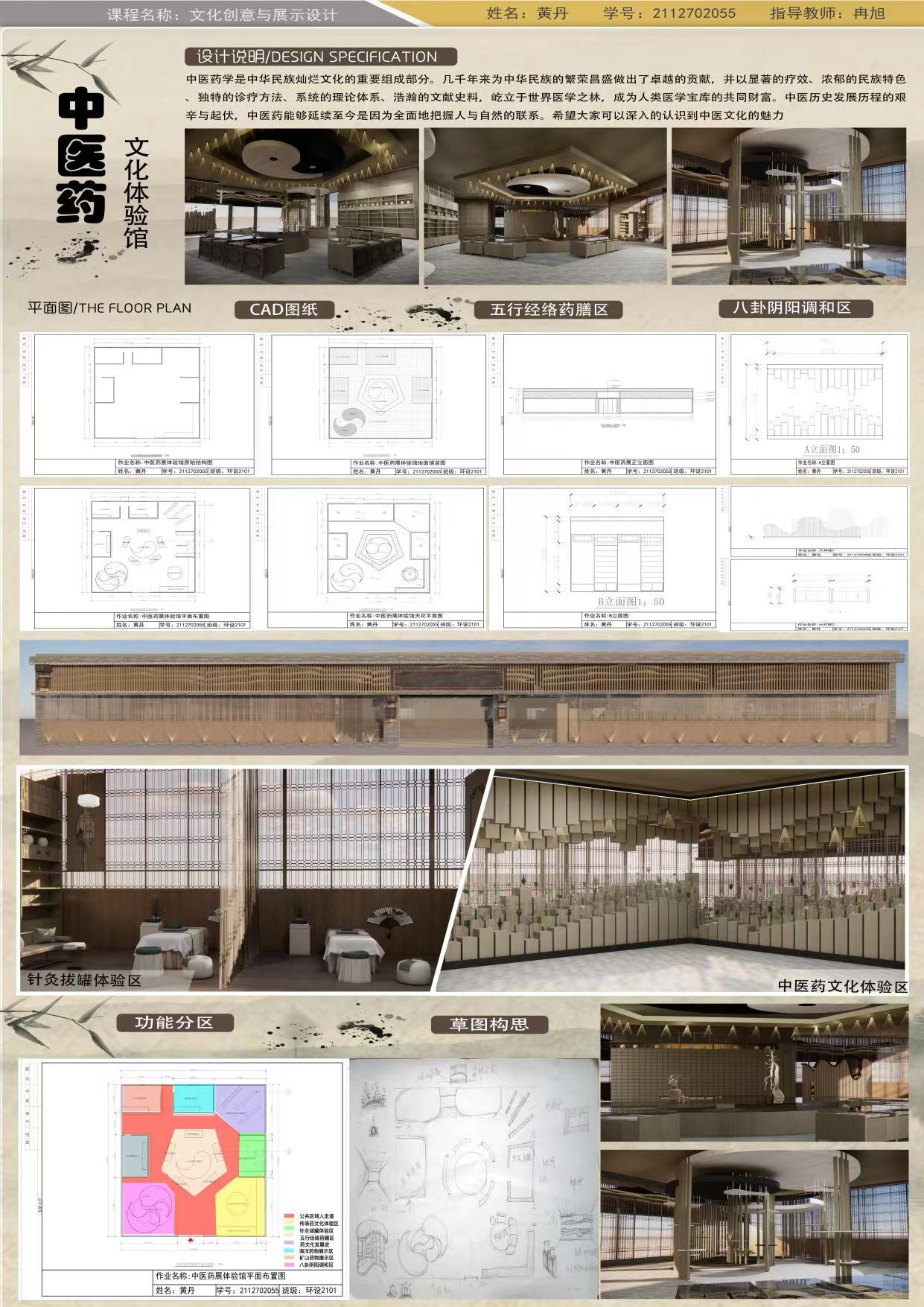 从知识目标方面,本课程通过对多元文化视角的理论知识系统的讲解,和案例分析,注重引导学生从多元文化的视角审视设计和展示。鼓励他们融合不同文化元素,设计具有国际视野的作品,为学生提供了深入文化创意与展示设计的知识体系。学生们通过课程学习,掌握了展示设计的理论和原则,同时也对文化创意的概念和实践有了更加清晰的认识。在作业展示环节,同学们展现出对于课程知识的深刻理解和应用能力,呈现出了高水平的学术素养。