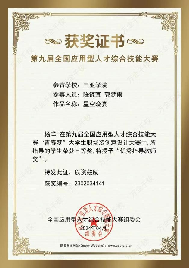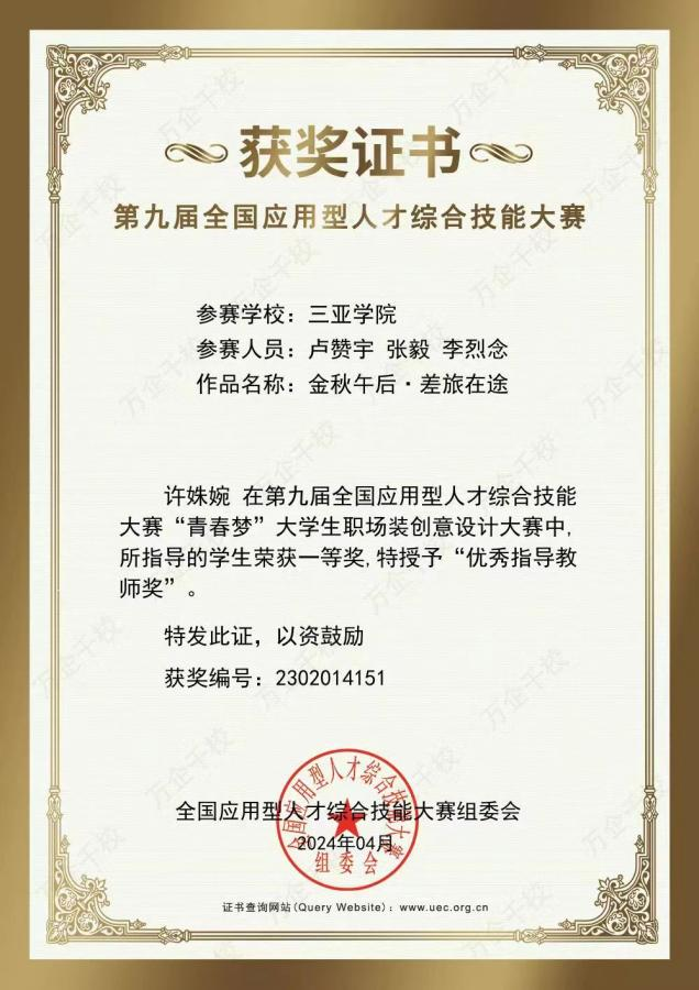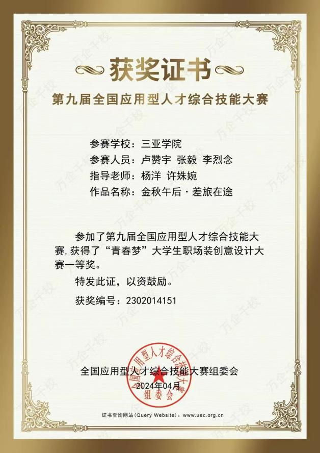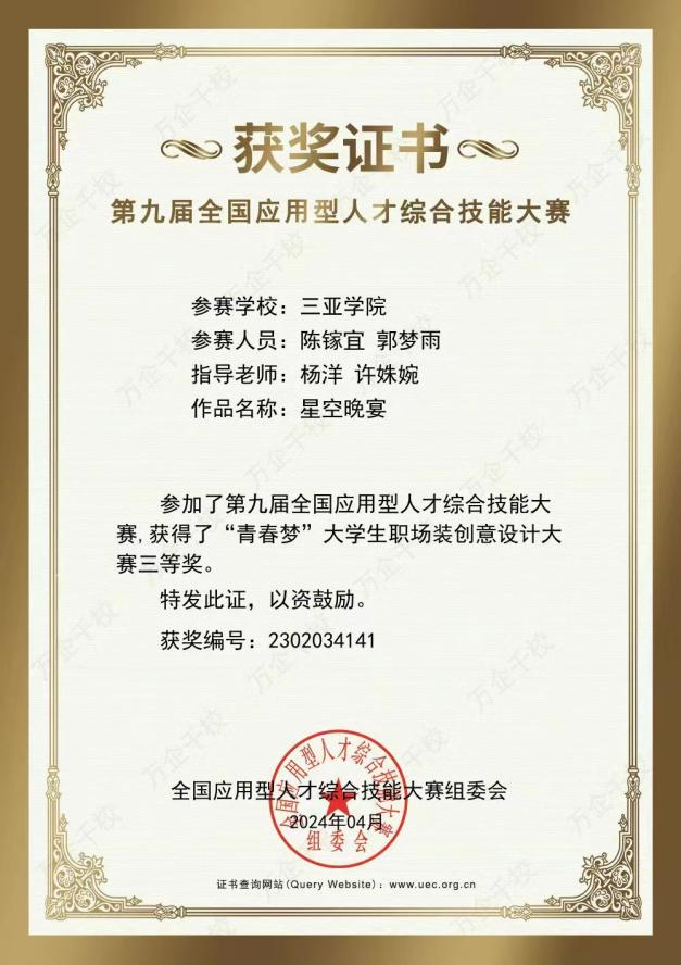 近日,由国家教育部主管、教育部高校毕业生协会主办的第九届全国应用型人才综合技能大赛——“青春梦”大学生职场装创意设计大赛决赛项目落下帷幕。本次大赛以“聚青春·创未来”为主题,自2023年10月启动以来,全国共有809所院校、16468支队伍报名参赛。我院服装专业学子在本次赛事中获得佳绩,专业组织参赛的二支队伍分别获得团队“一等奖”和团队“三等奖”的好成绩。指导老师杨洋、许姝婉荣获“优秀指导教师奖”。