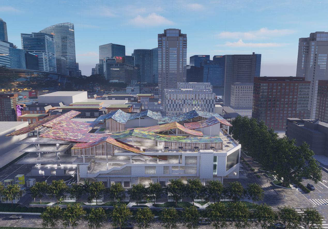 农贸市场区域被设计成一个充满生活气息和活力的空间。楼下是热闹喧嚣的烟火市集,楼上是闹中取静的休闲回廊。二层平台 为消费者提供了停下脚步、凭栏观望楼下丰富生活场景的视角。市场内部布局合理,摊位排列有序,方便居民快速找到所需的商品。同时,市场顶层内设有休息区,食品加工区,让消费者感受市场中的“烟火气” ,居民提供舒适的购物环境。统筹考虑菜市场的流线组织、功能配建,合理解决停车、环卫、物流等问题。在菜市场的建筑设计外观效果中。结合海南地域黎族文化符号进行融合,采用生动活泼的建筑形式,形成具有地区吸引力的城市新地标