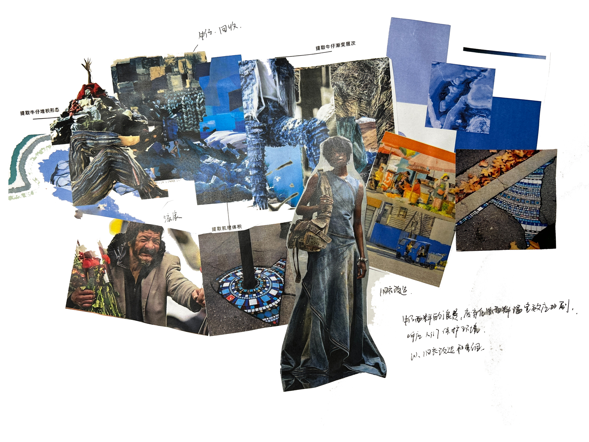 牛仔布又称靛蓝劳动布,色彩以靛蓝为主,是一种棉质粗纱布,质地厚实,纹路清晰。面料富有弹性、结实耐磨、风格可塑性强的优良特性,非常适合长时间穿着和使用。尤其对于拾荒者这样经常需要在各种环境下工作的人群来说,牛仔布的实用性无可替代。经过岁月的洗礼和人们的穿着牛仔表面往往会呈现出独特的磨损和褪色痕迹,这些痕迹为再设计提供了无限的可能性。