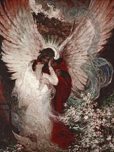 这幅作品中,一个天使张开巨大的翅膀,深情亲吻怀中的女子。构图非常有视觉冲击力,画面色调褐红大气沉稳却不失轻盈,浪漫而梦幻。这种风格不仅仅是一种艺术手法,更是一种人们对美好事物的向往和永远不停止的追求。