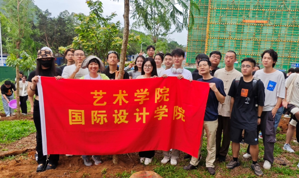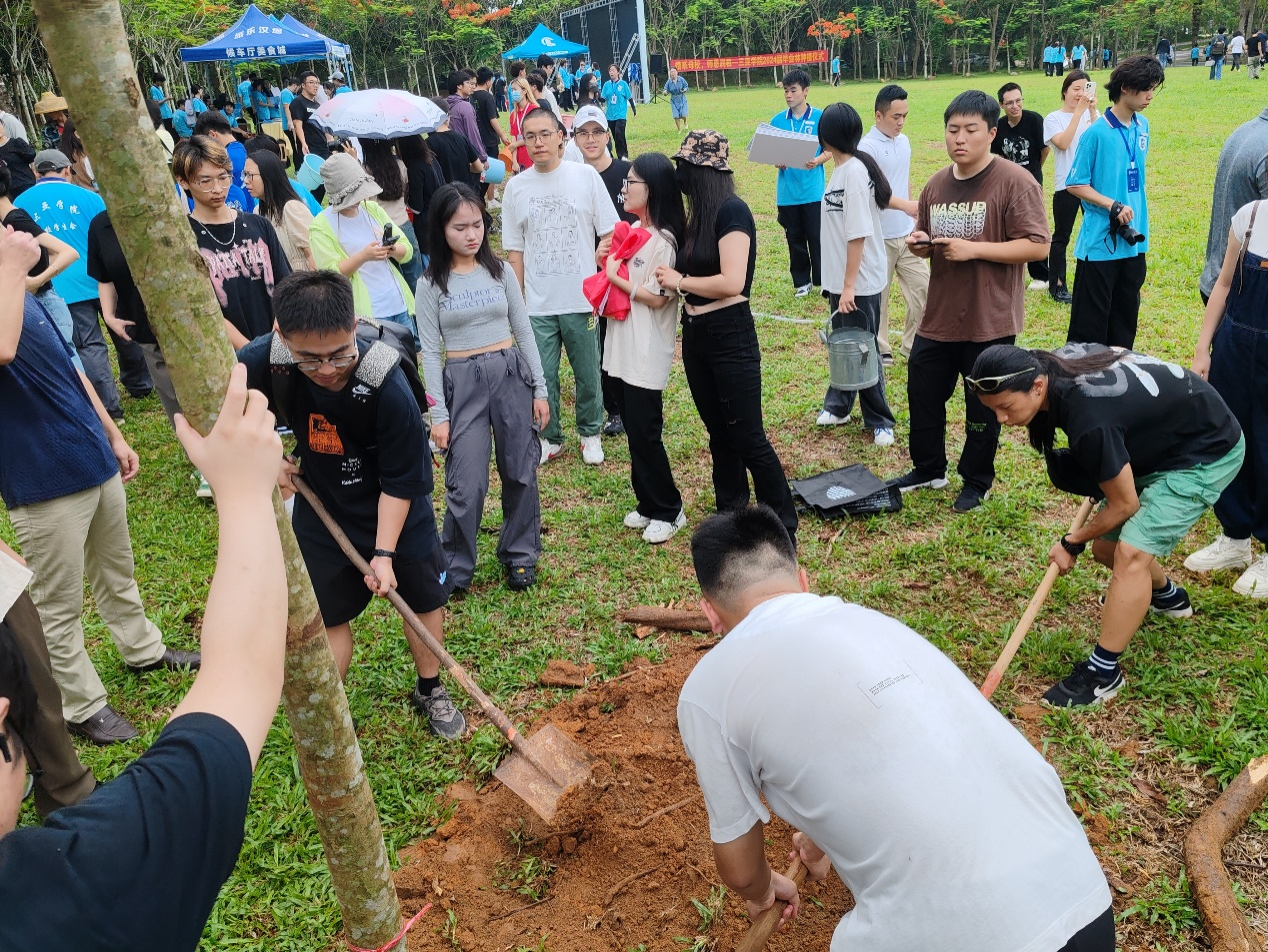 艺术暨国际设计学院院长陈琳及团委副书记谢洪浪同我院思想导师一起携手学生们,挖坑、填土、浇水,我院学生人生如同这棵刚刚种植的树苗,虽然现在还很小,但只要有充足的阳光、水分和营养,总有一天,它会长成一棵参天大树,为世界带来阴凉和美丽。希望毕业生在母校的留恋中,如同这棵树对土壤的依恋,无法言表却深刻而真切。在这里,你们学会了知识,更学会了成长;在这里,你们收获了友谊,更收获了人生的智慧。每一次回望,都是对过去美好时光的怀念;每一次展望,都是对未来美好生活的向往。