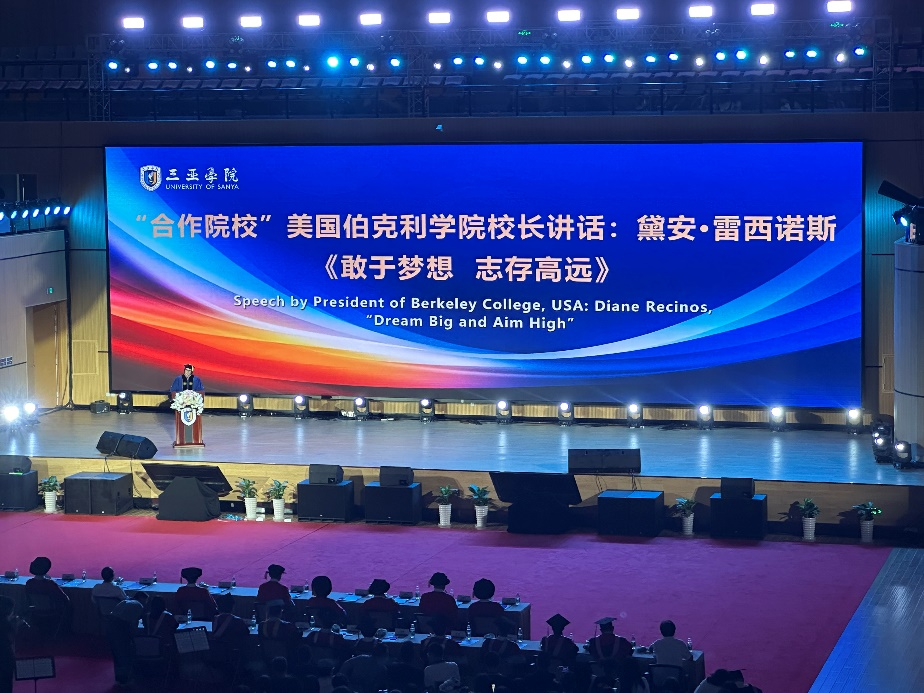 最后是万众瞩目的“合作院校”美国伯克利学院校长黛安.雷西诺斯讲话,这份祝词是全场最精彩的部分,现场的同学们欢呼不断,表达着对这位来自美国的优秀女性的尊敬与崇拜。同时,她的贺词也更加勾起了毕业生们对于接下来人生道路的向往,相信大家在未来的日子里也能够做到“敢于梦想,志存高远”。