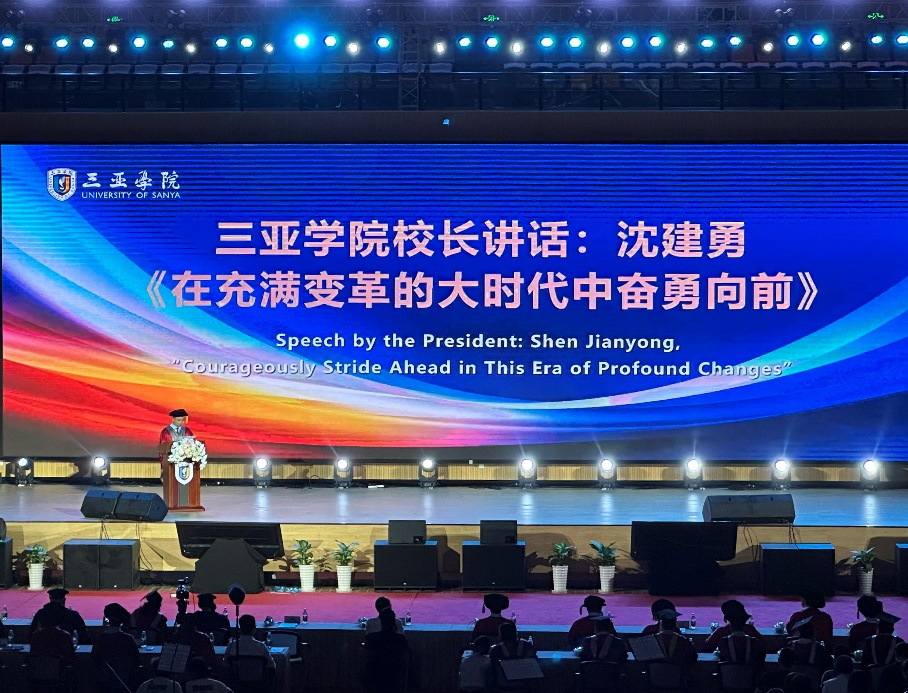 三亚学院校长沈建勇发表了题为《在充满变革的大时代中奋勇向前》的毕业致辞,向全体毕业生表示热烈的祝贺,并对他们的未来发展提出了建议。校长鼓励毕业生们要保持积极进取的精神,不断追求卓越,为社会做出贡献。校长的淳淳教诲表达了他对毕业生们的期盼,希望同学们承载着母校的精神,从容出发,坚韧前行。