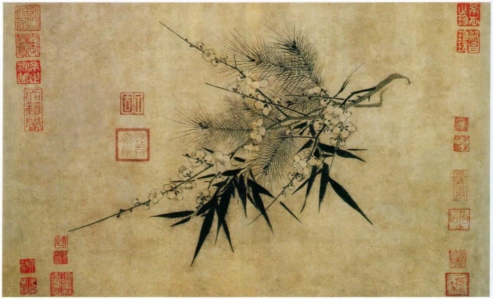《岁寒三友图》为南宋画家赵孟坚所作,其以纨扇、绢本作材料,以松竹梅作绘画对象,岁寒三友无论哪方均具有坚韧不拔,傲然无畏的价值精神,现将三者汇在一起,仿若“群英聚集”,暗带幽然气质。