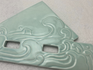 第三种材质是陶瓷(图8),陶瓷的制作周期较长,首先是擀泥板,根据需要的厚度进行擀制,接下来在泥板上根据所需要的形状切割,然后等待泥坯风干,在这个过程中需要进行修坯、装饰,最后施釉最入窑高温烧成。