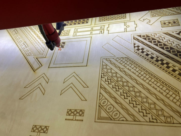 在打装饰纹样的时候出现木头极易烧焦并出现木材顺着木纹断裂。最后的解决办法是调整激光切割机在切割的时候输出的参数。白木的纹样装饰也有十分强烈的视觉效果。