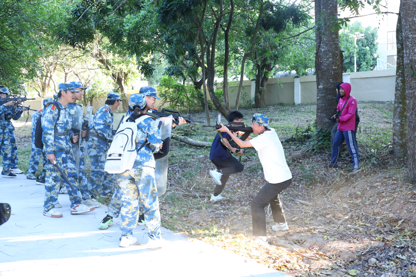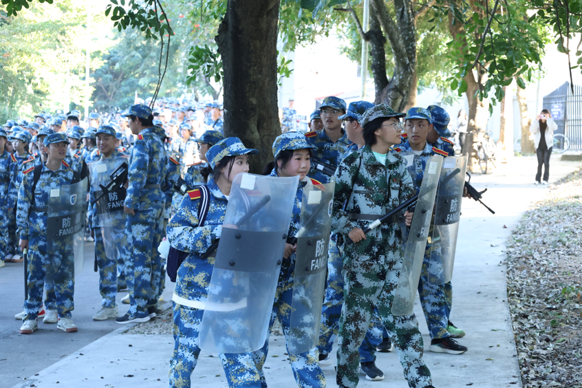 清晨,参训学生们在教官的带领下,迈着整齐有力的步伐出发。艺术暨国际设计学院同学们的队伍如长龙蜿蜒,一路旗帜飘扬。拉练过程中,学生们不仅要克服身体的疲劳,还要应对各种“突发情况”模拟演练,如“通过染毒地带”时的快速防护动作、“遭遇敌机空中侦察”时的隐蔽伪装等,这些项目极大地考验了他们的应变能力和军事素养。